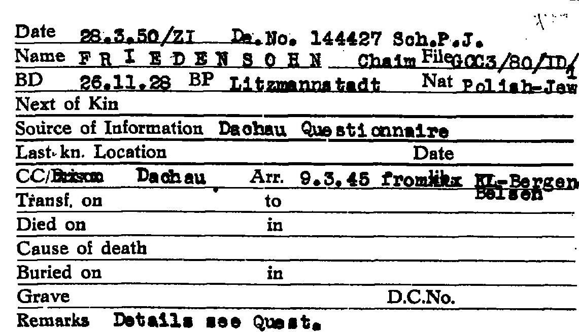 | Friedensohn | Chaim | 1928 | unbekannter Ort, | Kartei des Internationalen Suchdienstes Bad Arolsen |
