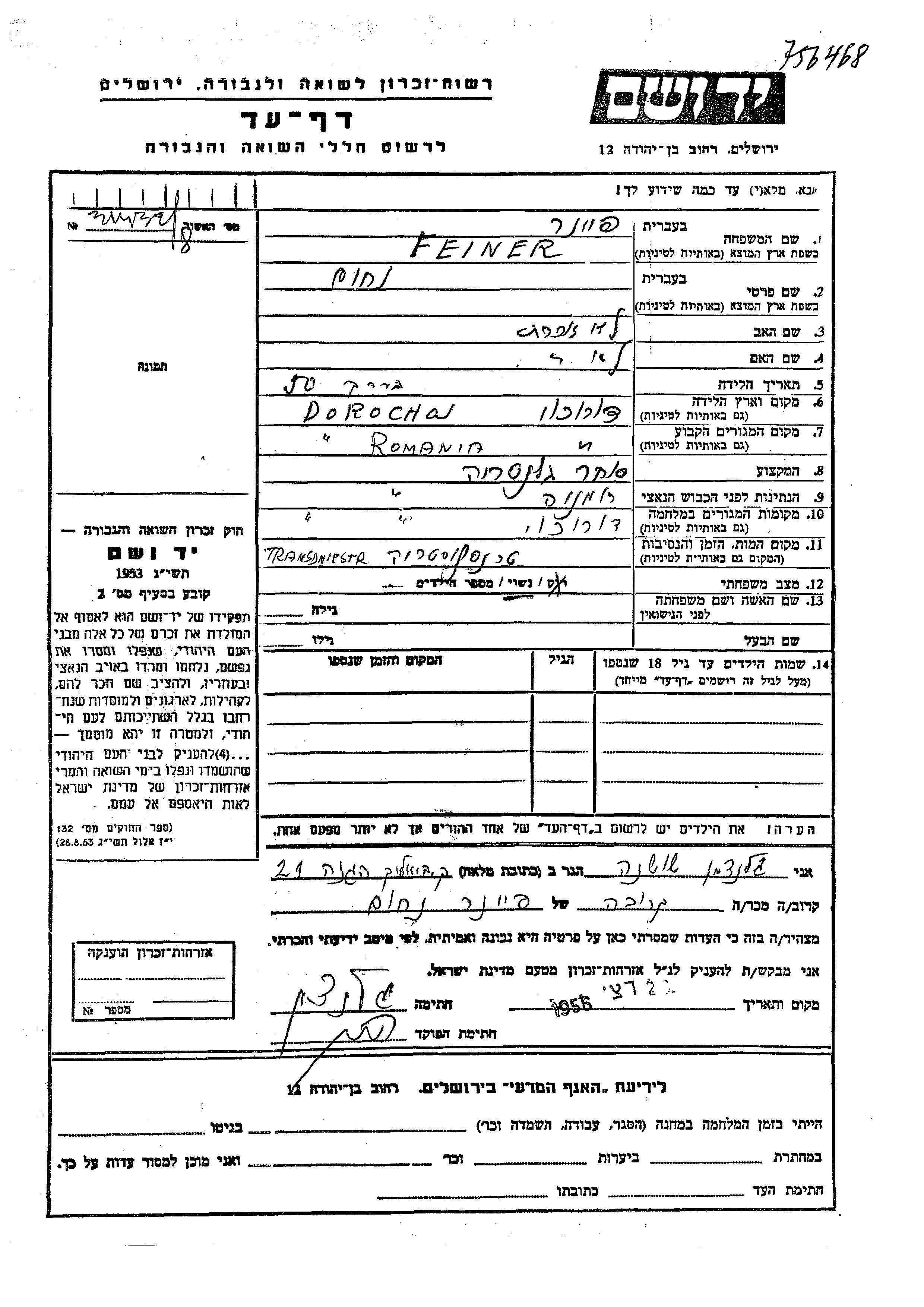 Nakhum Feiner wurde in Dorochoi, Rumänien geboren. Er war Galanteriewarenhändler und Verheiratet. Vor dem Zweiten Weltkrieg lebte er in Dorochoi, Rumänien. Während des Krieges war er in Dorochoi, Rumänien.