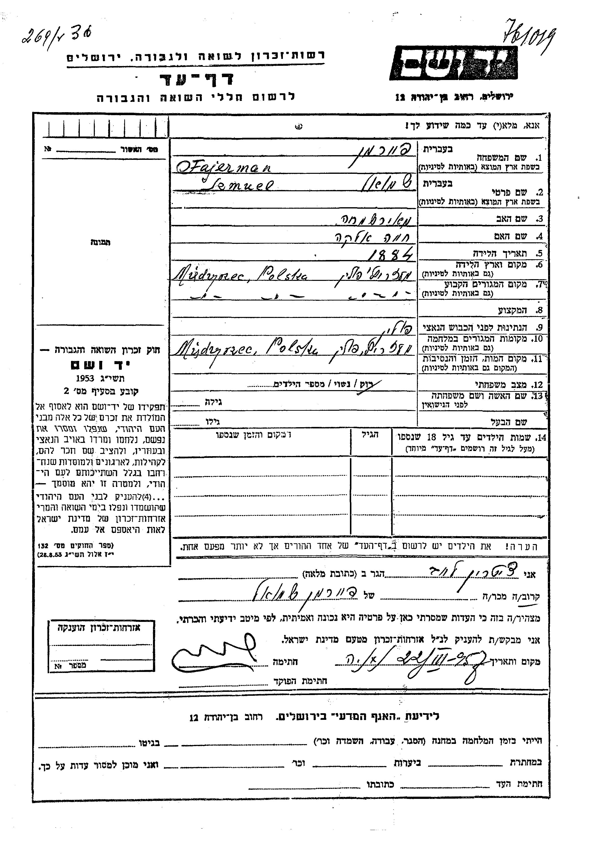 Semuel Fajerman wurde im Jahr 1884 in Miedzyrzec Podlaski, Polen geboren. Er war der Sohn von Meir Simkha und Khaia Elka. Er war Verheiratet. Vor dem Zweiten Weltkrieg lebte er in Miedzyrzec Podlaski, Polen. Während des Krieges war er in Miedzyrzec Podlaski, Polen.