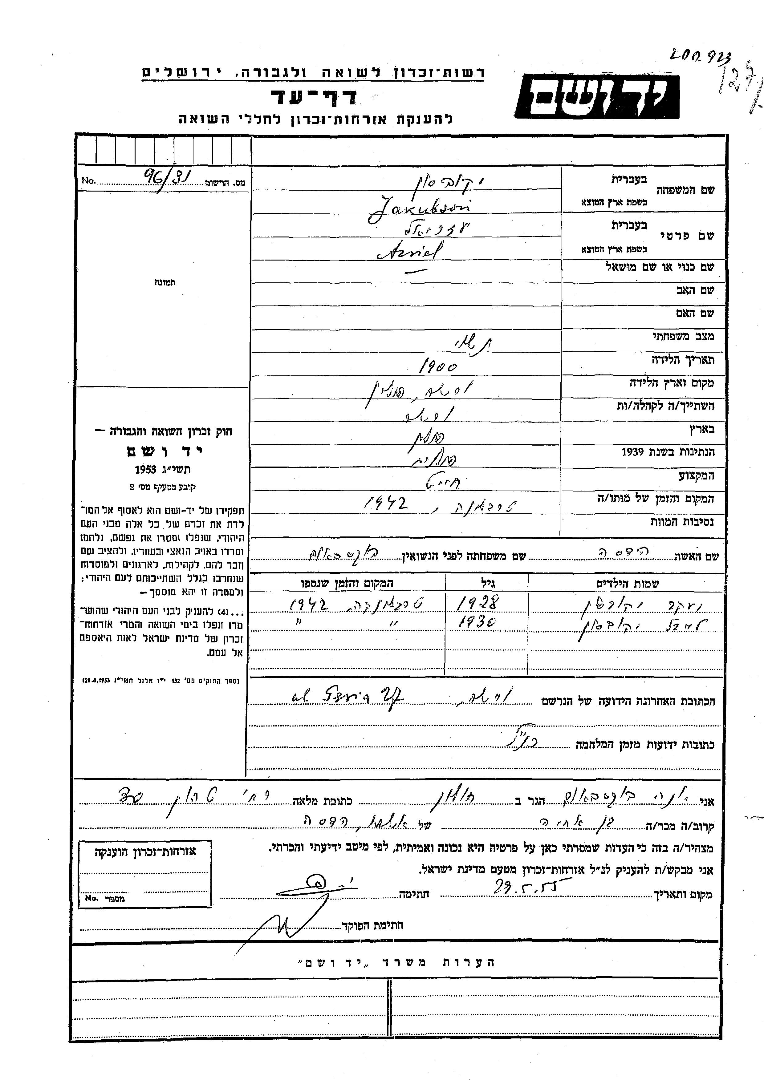 Azriel Jakubson wurde im Jahr 1900 in Warsaw, Polen geboren. Er war Schneider und mit Hadasa, geb. Buksbaum Verheiratet. Vor dem Zweiten Weltkrieg lebte er in Warsaw, Polen. Während des Krieges war er in Warsaw, Polen.
