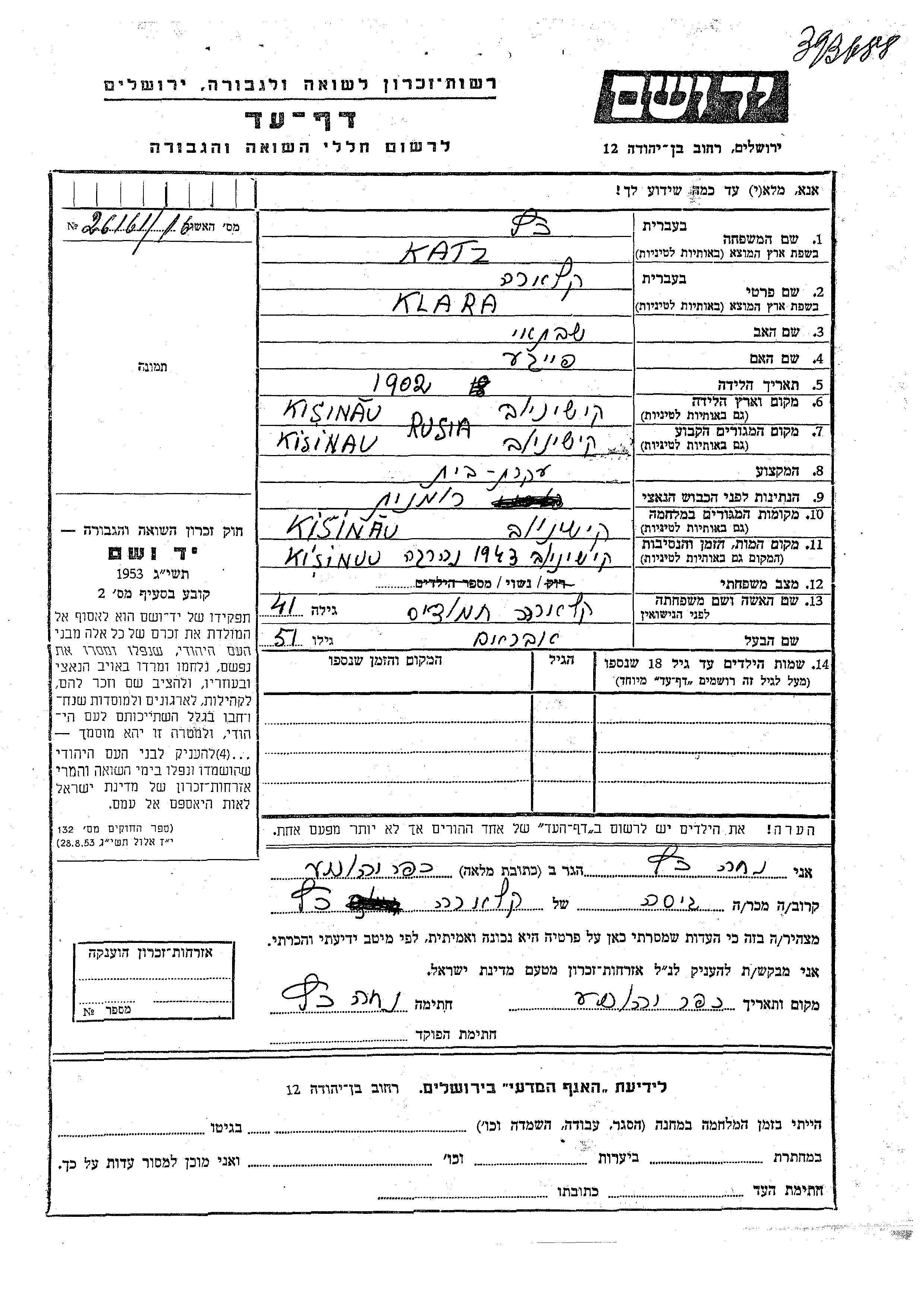 Klara Katz, geb. Khamudis wurde im Jahr 1902 in Kisinev, Rumänien geboren. Sie war die Tochter von Shabtai und Feige. Sie war Hausfrau und mit Avraham Verheiratet. Vor dem Zweiten Weltkrieg lebte sie in Kisinev, Rumänien. Während des Krieges war sie in Kisinev, Rumänien.