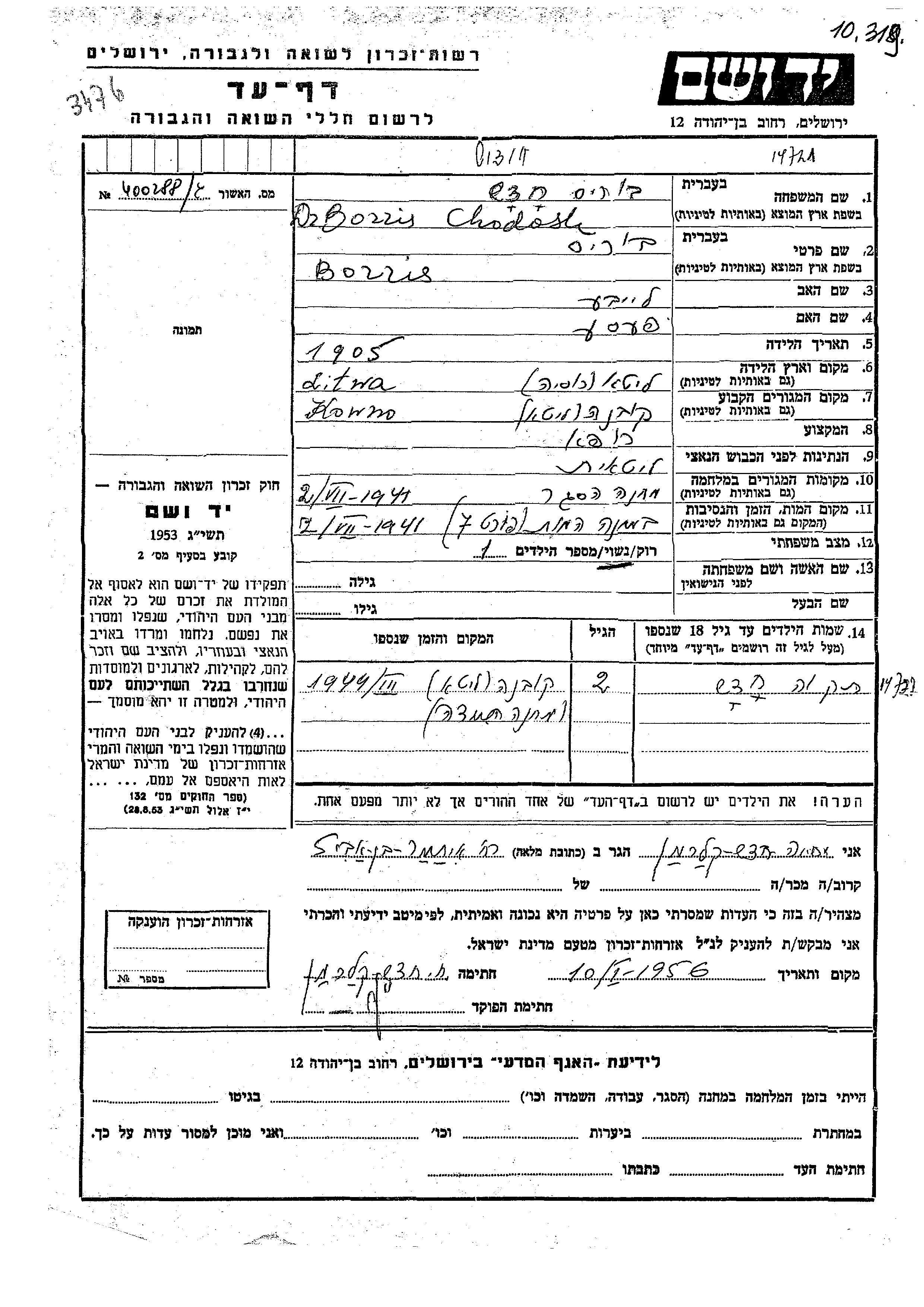 Dr. Borris Chodosh wurde im Jahr 1905 in Litauen geboren. Er war der Sohn von Leibe und Pese. Er war Arzt/ärztin und Verheiratet. Vor dem Zweiten Weltkrieg lebte er in Kowno, Litauen. Während des Krieges war er in Litauen.