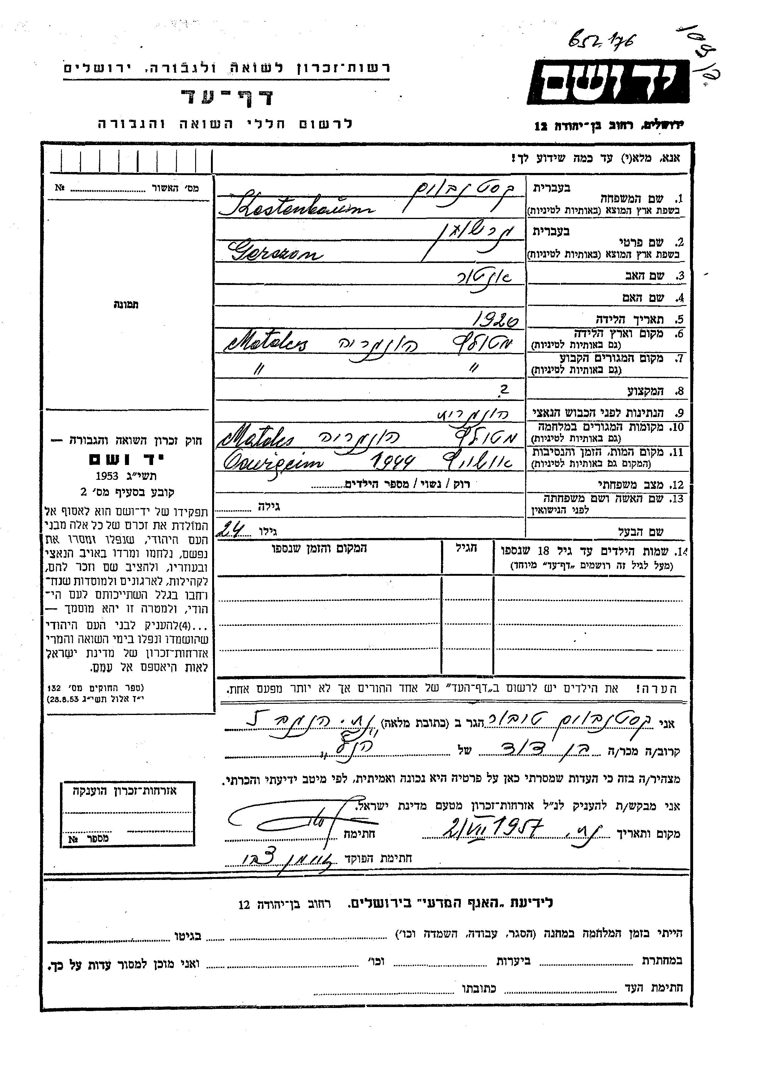 Kestenbaum Gerszon 1920 Matolcs, Ungarn Gedenkblatt
