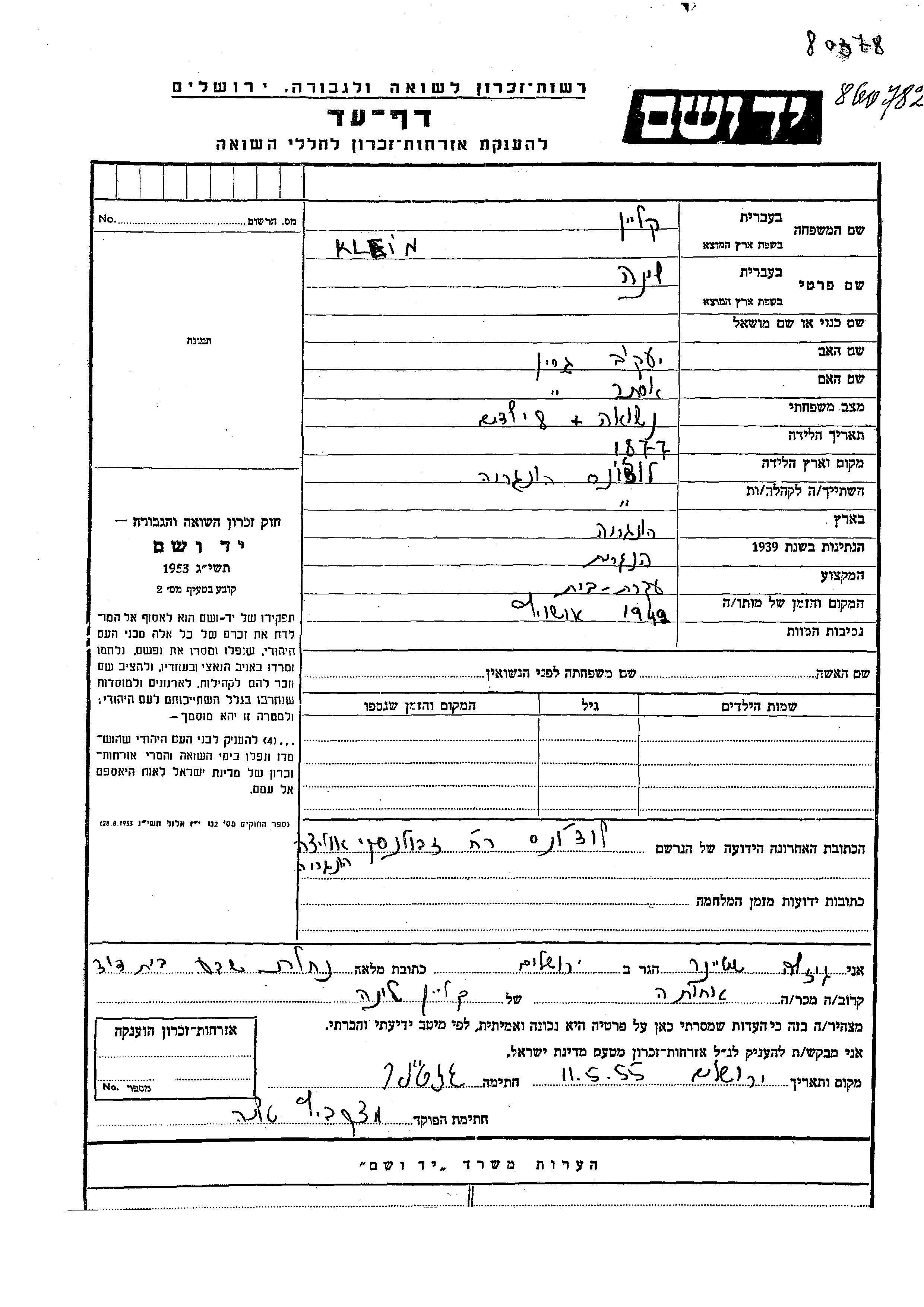 Sheina Klein, geb. Grin wurde im Jahr 1877 in Lucenec, Tschechoslowakei geboren. Sie war die Tochter von Yaakov und Ester. Sie war Hausfrau. Vor dem Zweiten Weltkrieg lebte sie in Lucenec, Tschechoslowakei.
