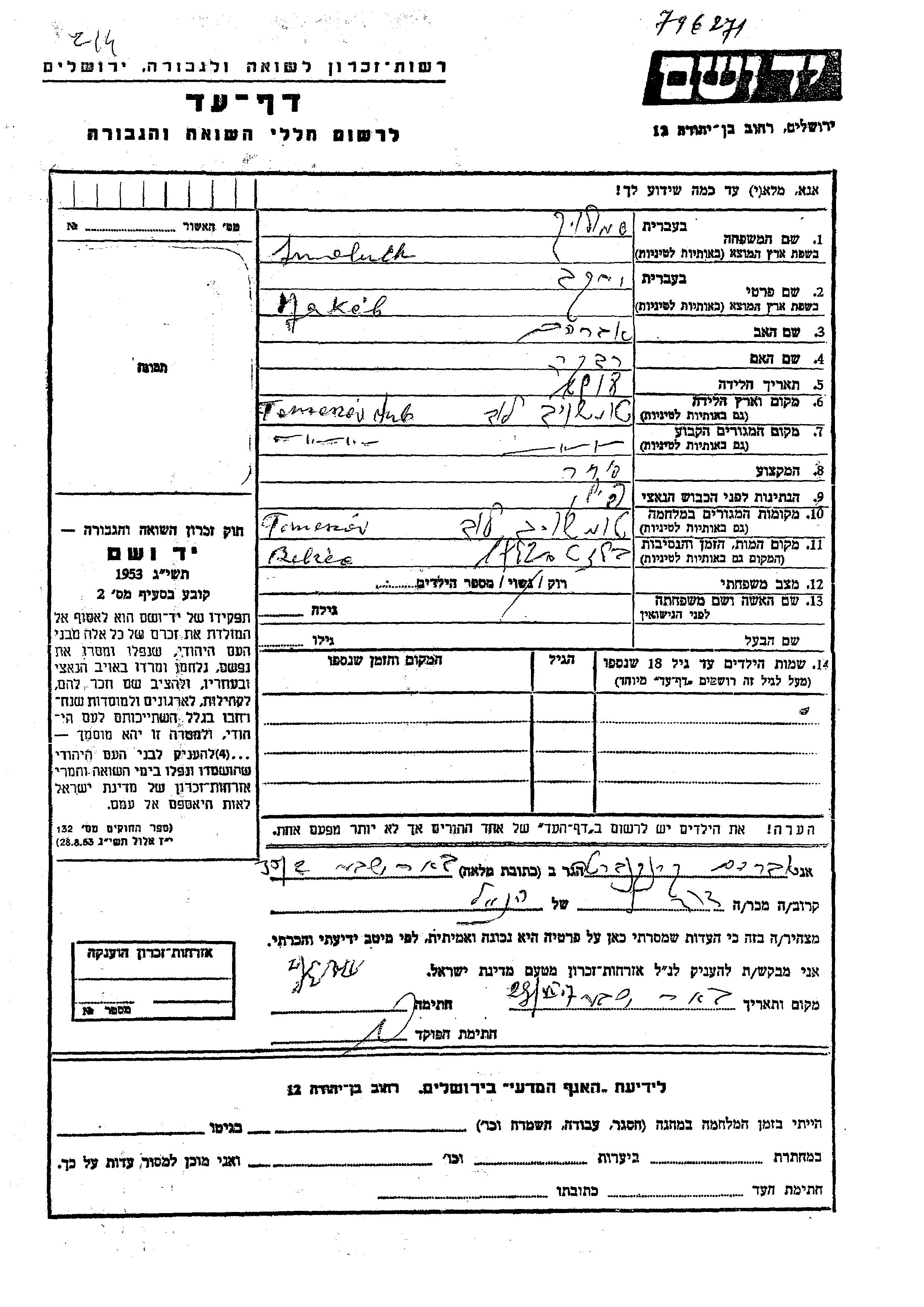 Yakob Smoluch wurde im Jahr 1918 in Tomaszow Lubelski, Polen geboren. Er war der Sohn von Avraham und Rivka. Er war Kaufmann/-frau und Ledig. Vor dem Zweiten Weltkrieg lebte er in Tomaszow Lubelski, Polen. Während des Krieges war er in Tomaszow Lubelski, Polen.
