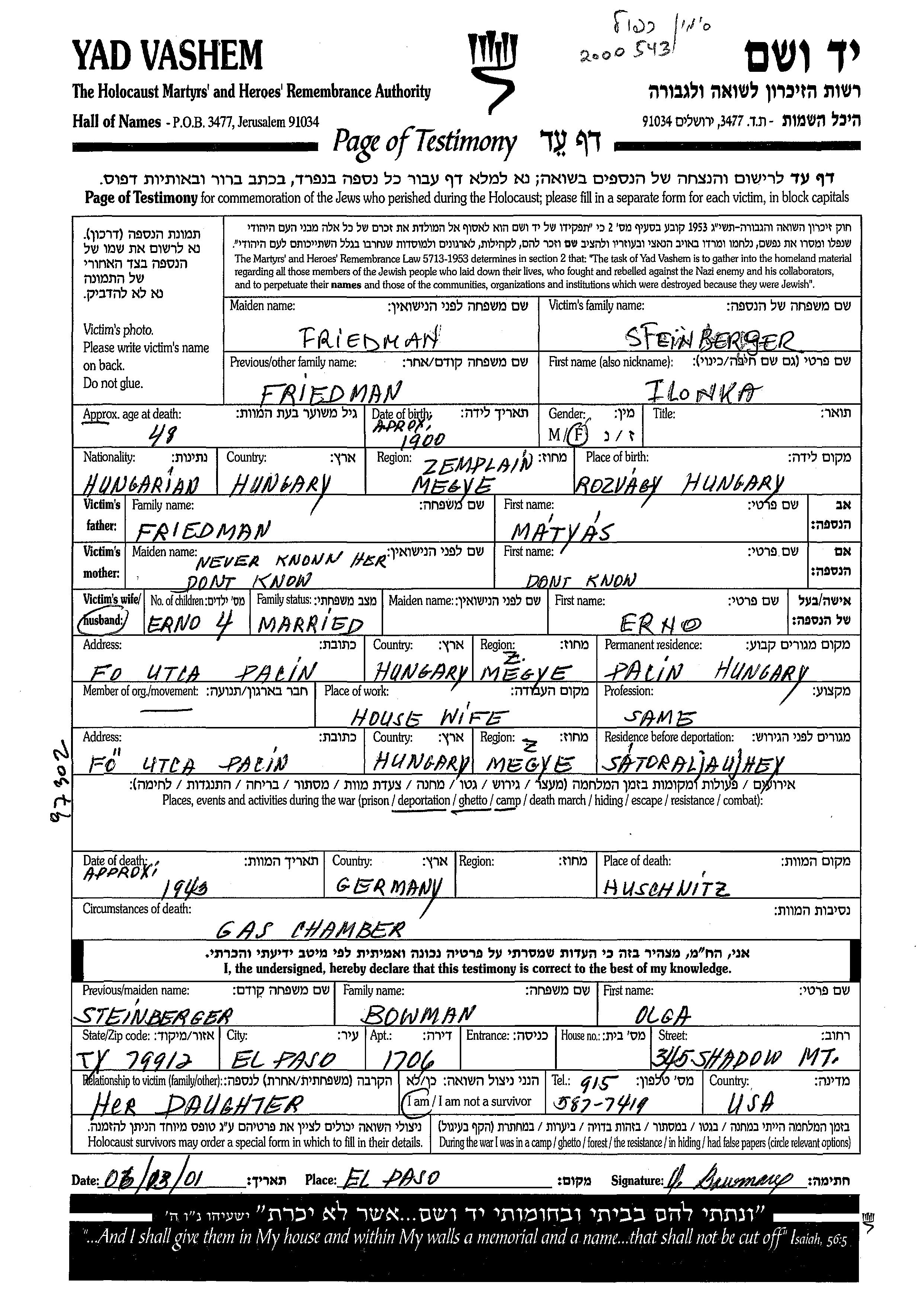 Ilonka Steinberger, geb. Friedman wurde im Jahr 1897 in Rozvagy, Ungarn geboren. Sie war Hausfrau. Vor dem Zweiten Weltkrieg lebte sie in Pacin, Ungarn.