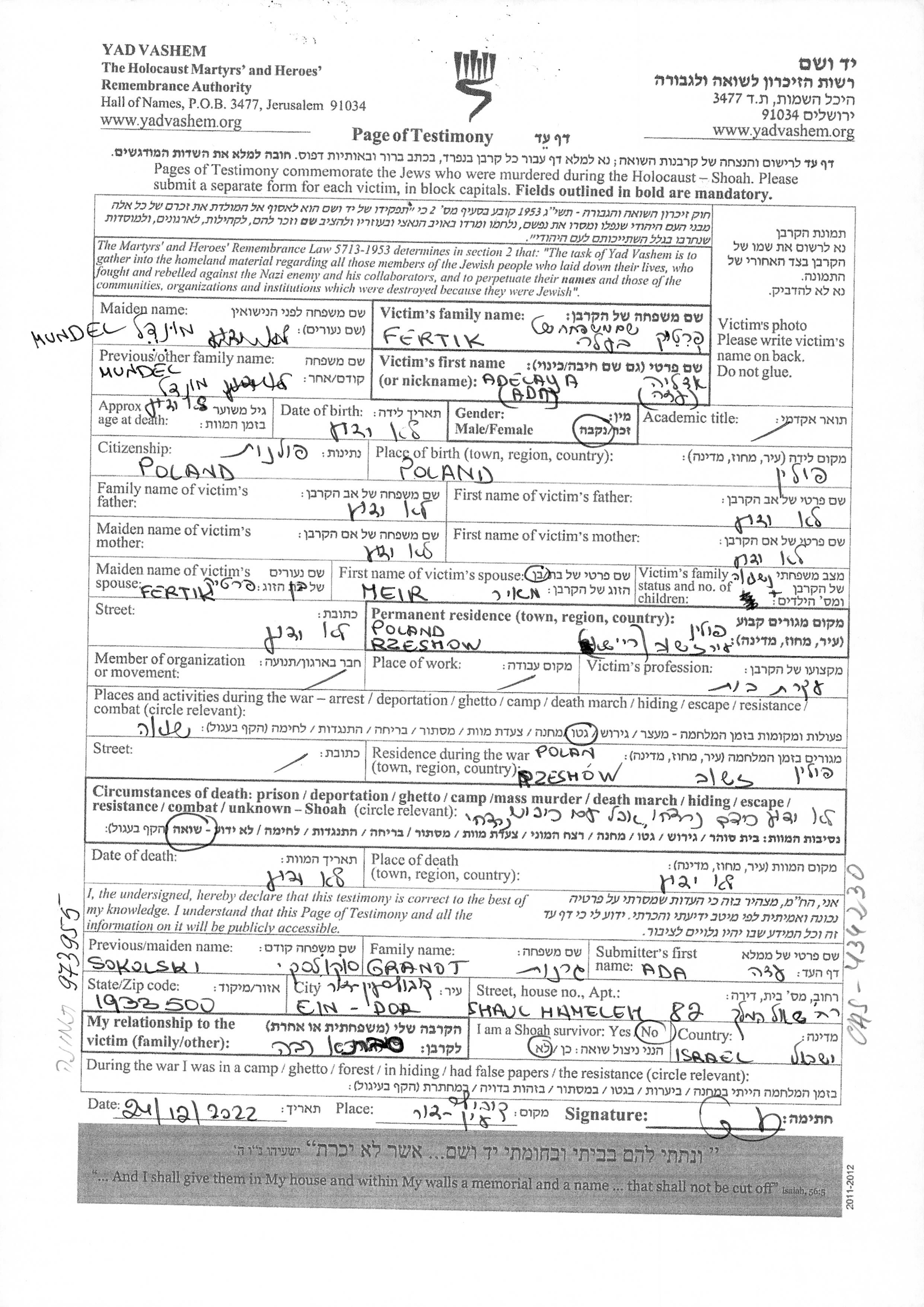 Adelaya Ada Fertik, geb. Mundel wurde in Polen geboren. Vor dem Zweiten Weltkrieg lebte sie in Rzeszow, Polen.