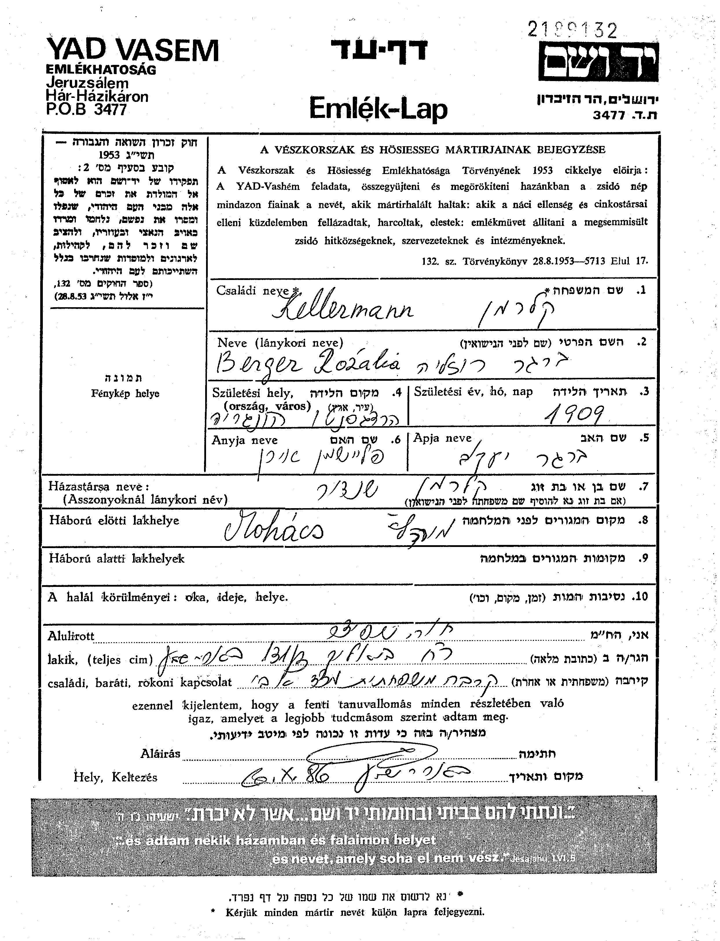 | Kellermann | Rozsa | 1909 | Jenofalva, | Liste von ermordeten Juden aus Ungarn |