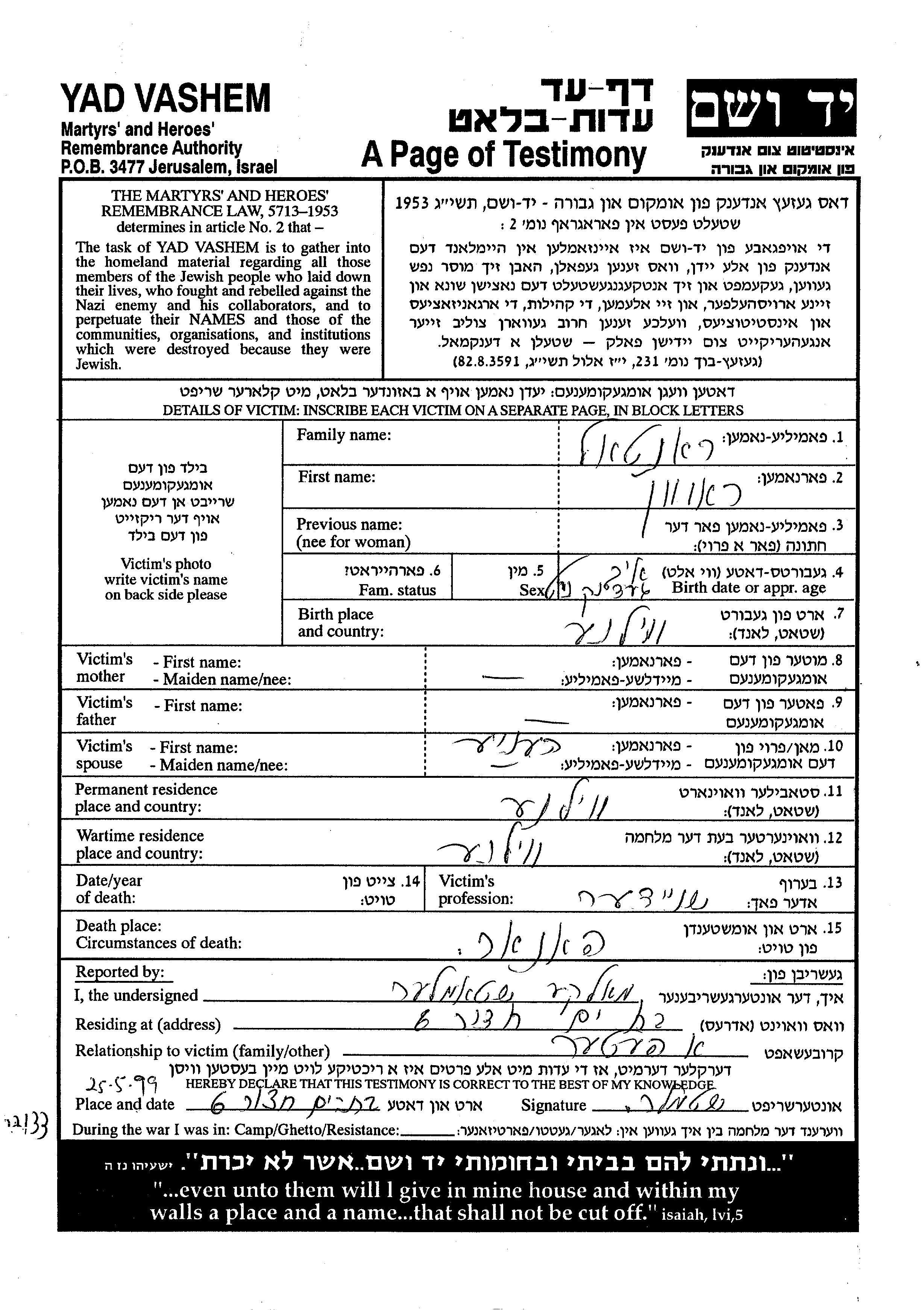Reuven wurde in der Schoah ermordet. Todesort: Wilno, Polen.