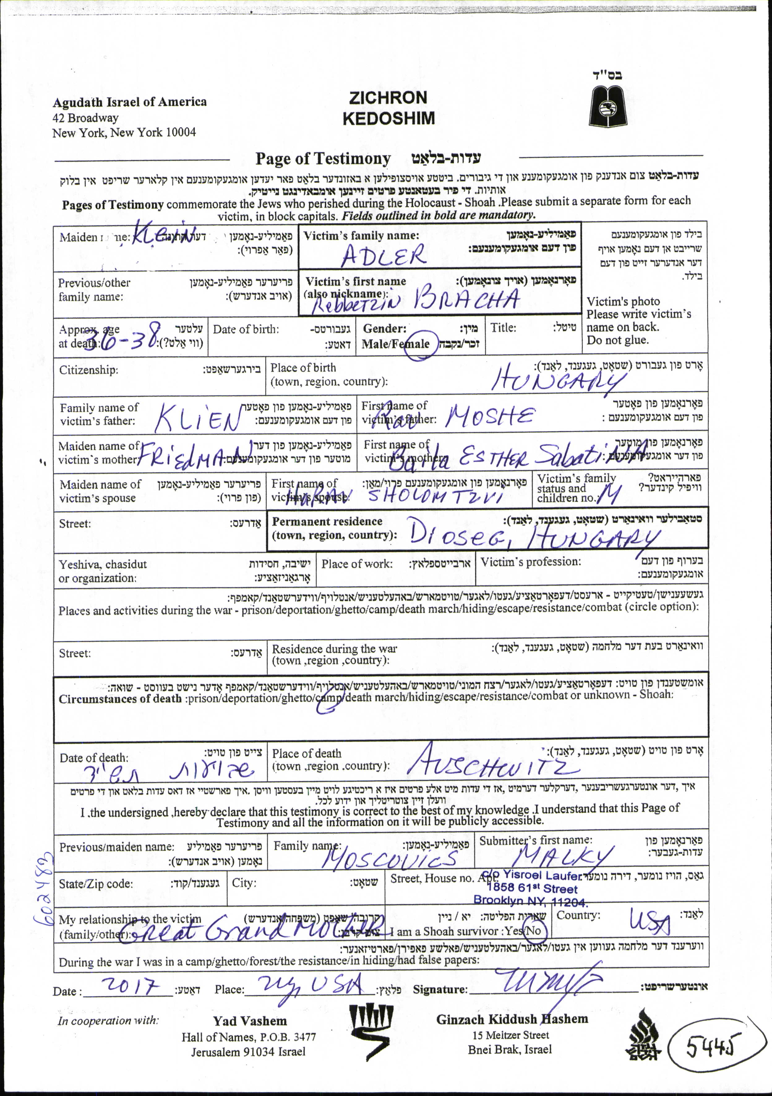 Brakha Adler, geb. Klein wurde in Ungarn geboren. Vor dem Zweiten Weltkrieg lebte sie in Dioszeg.
