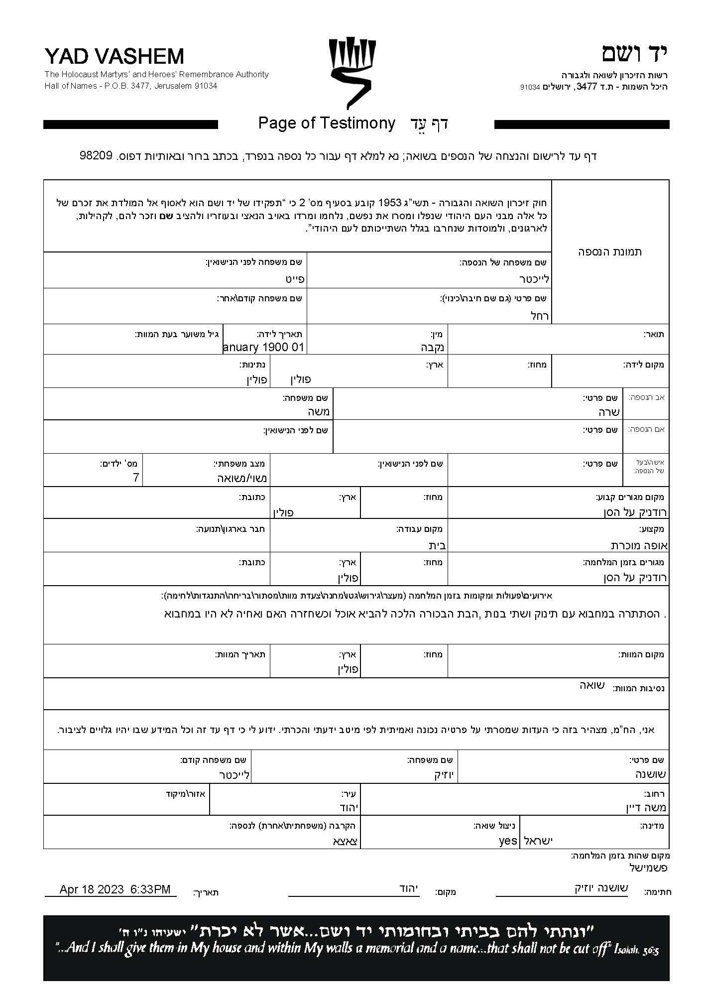 Rakhel Laikhter, geb. Feit wurde im Jahr 1900 in Polen geboren. Sie war Bäcker/-in. Vor dem Zweiten Weltkrieg lebte sie in Rudnik nad Sanem, Polen.