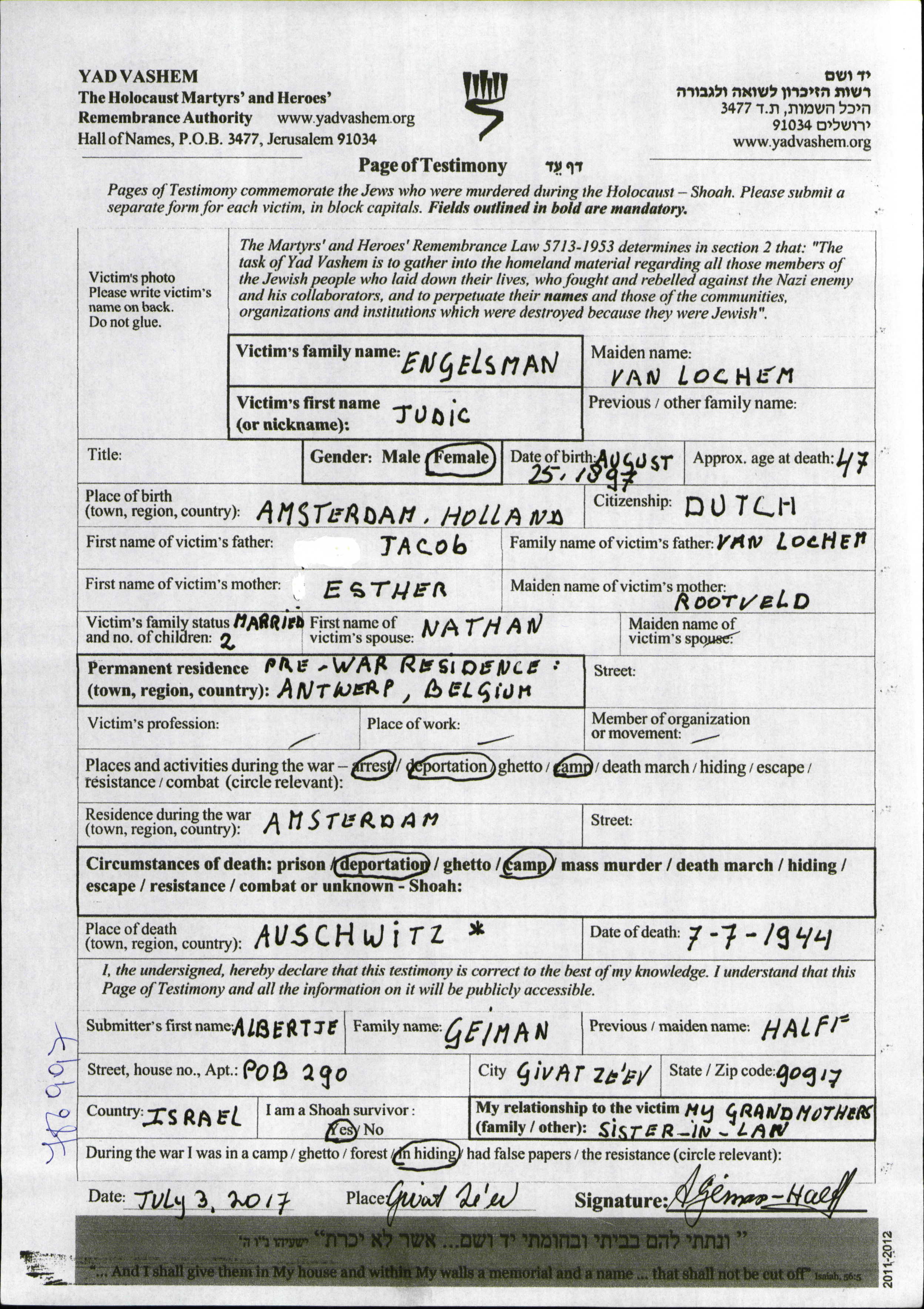 Engelsman Judic 1897 Amsterdam, Niederlande Liste von ermordeten Juden aus Holland