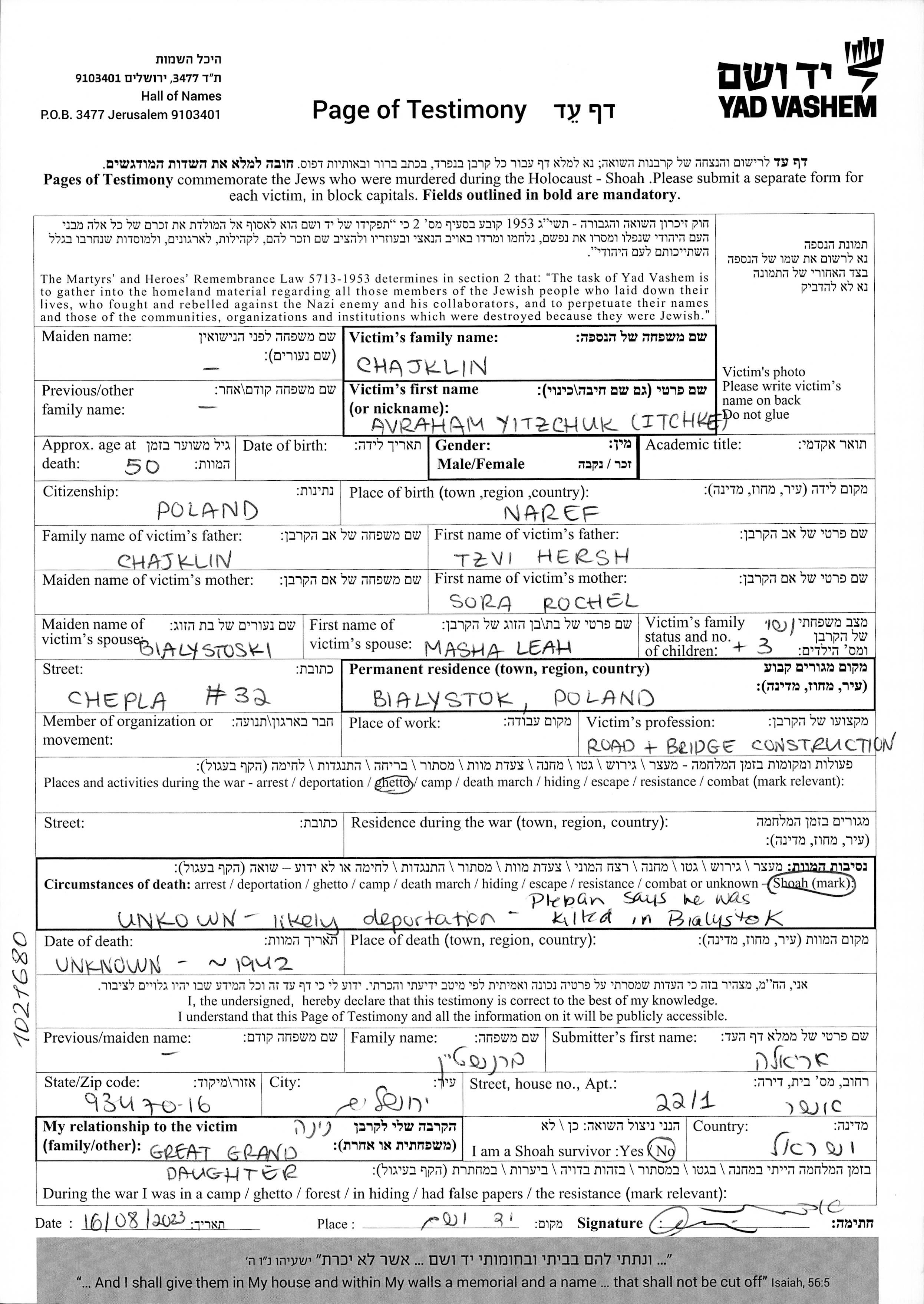 Avraham Yitzchuk Chajklin wurde in Narew, Polen geboren. Er war der Sohn von Tzvi Hersh und Sora Rochel. Er war mit Masha Leah, geb. Bialystoski Verheiratet. Vor dem Zweiten Weltkrieg lebte er in Bialystok, Polen. Während des Krieges war er in Getto.
