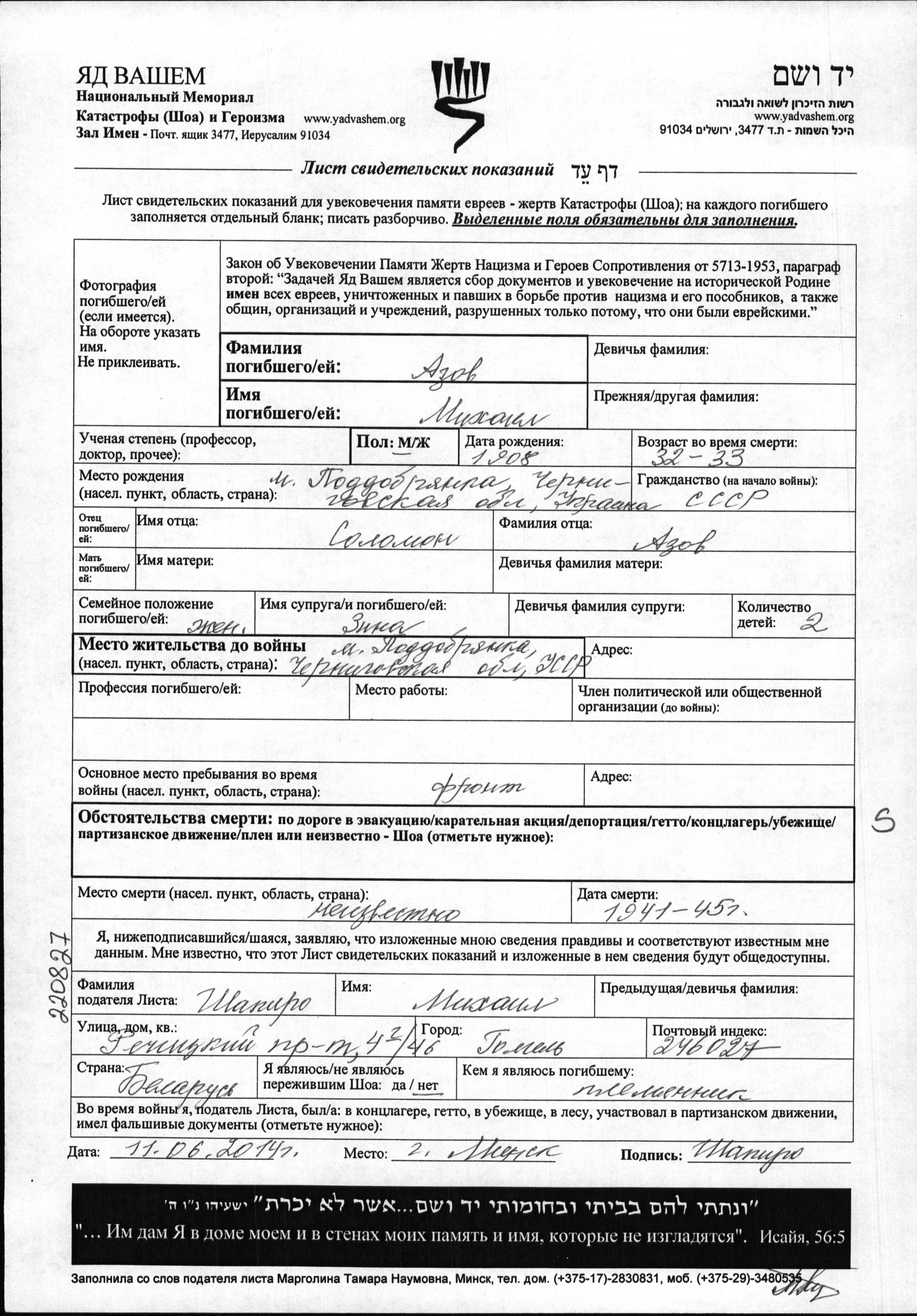 Mikhail Azov wurde im Jahr 1902 in Poddobryanka, Weißrussland (UdSSR) geboren. Vor dem Zweiten Weltkrieg lebte er in Gomel, Weißrussland (UdSSR).