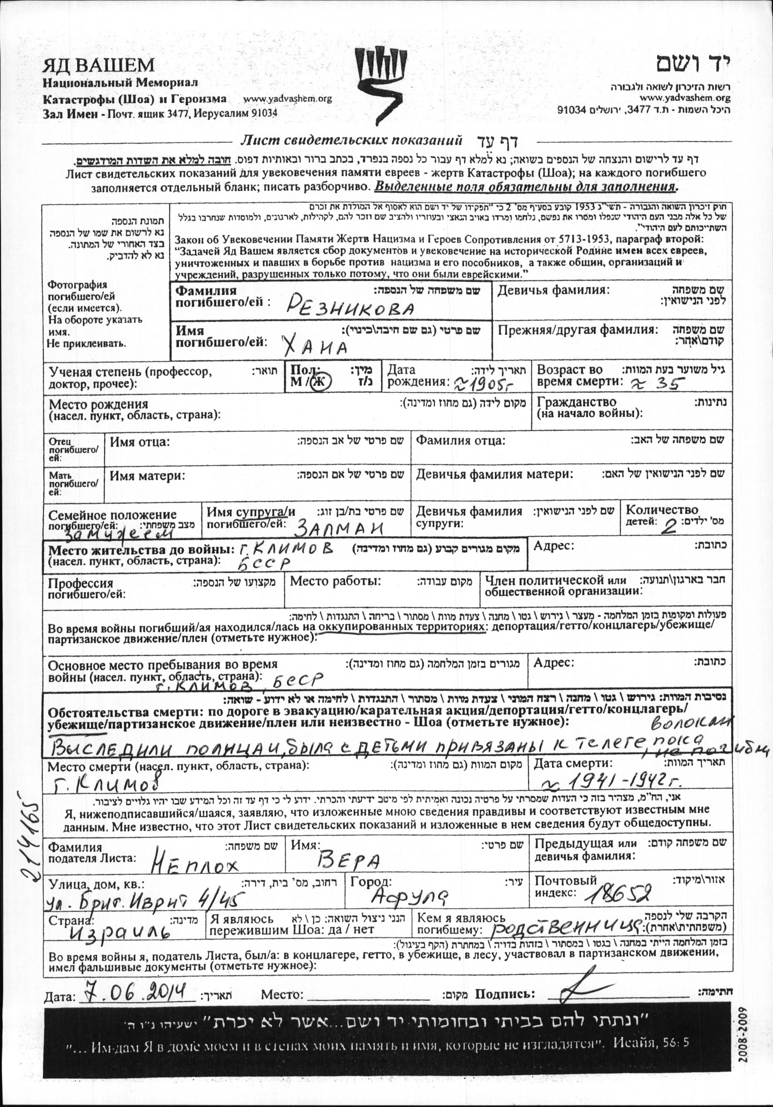Reznikova Khana Klimovo, Russland (UdSSR) Verfolgtenliste