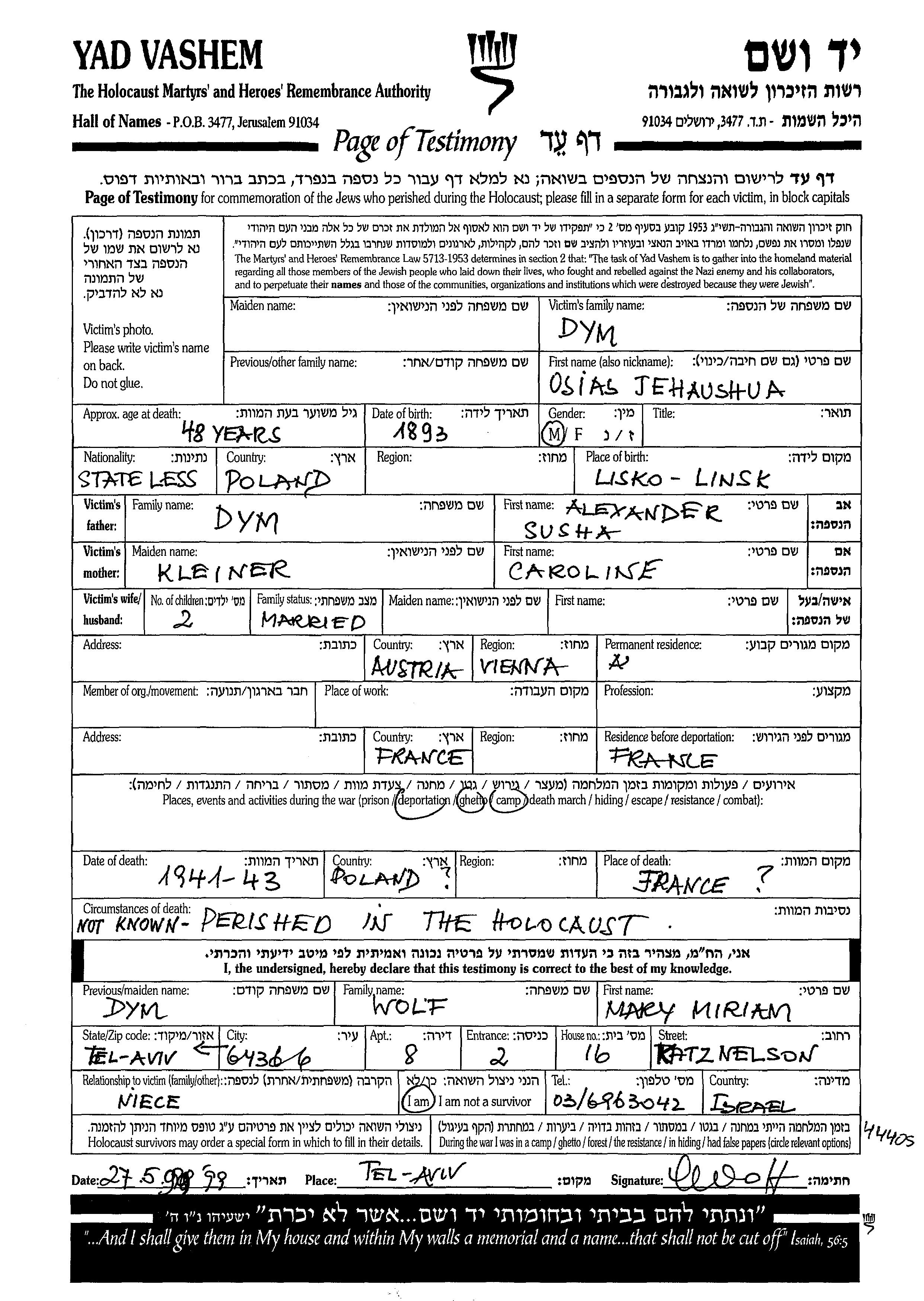Osias Dym wurde im Jahr 1893 in Lisko, Polen geboren. Vor dem Zweiten Weltkrieg lebte er in Vienna, Österreich.