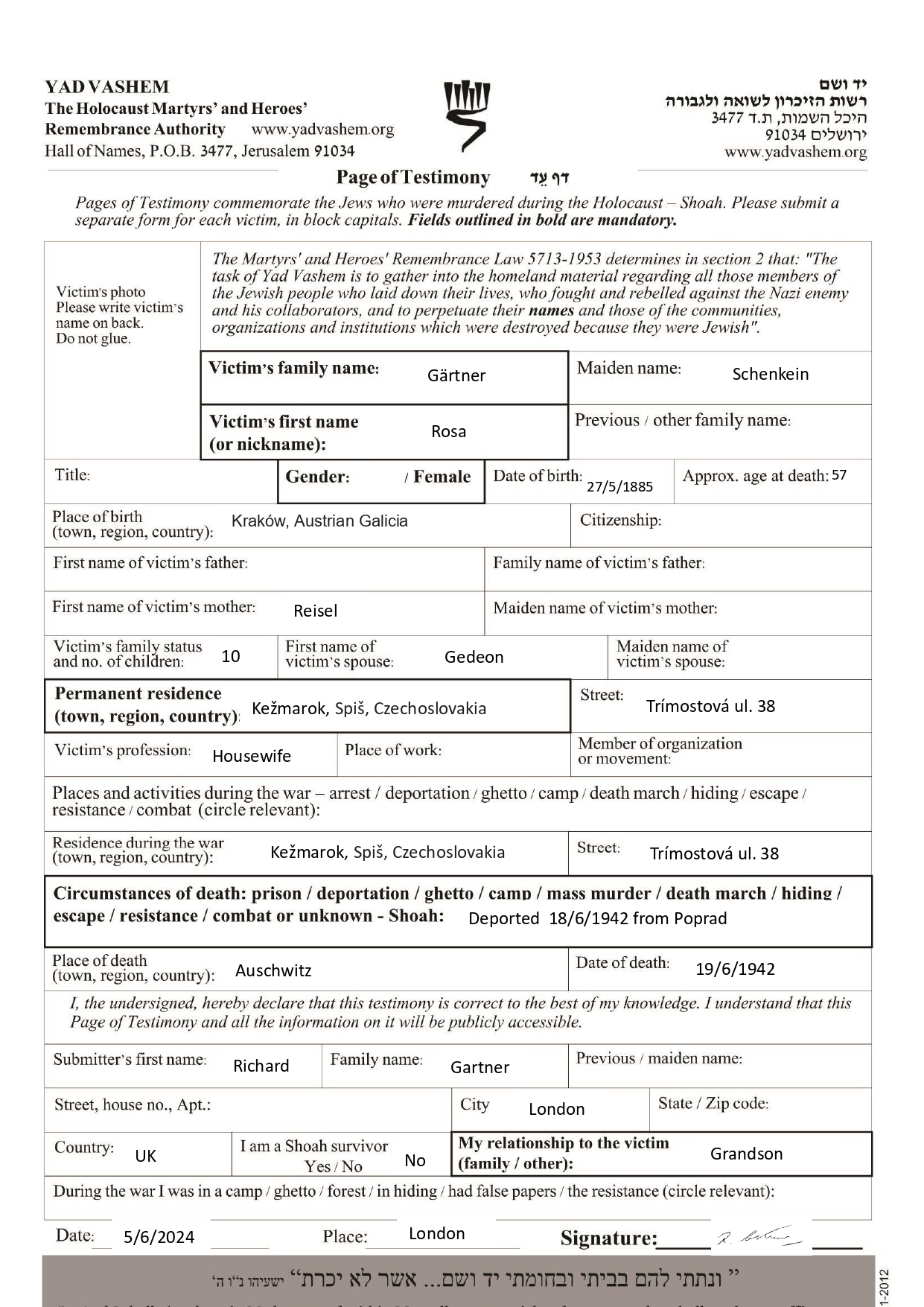 Roza Rahel Gertner, geb. Shenken wurde im Jahr 1887 in Krakow, Polen geboren. Sie war Hausfrau. Vor dem Zweiten Weltkrieg lebte sie in Kezmarok, Tschechoslowakei.