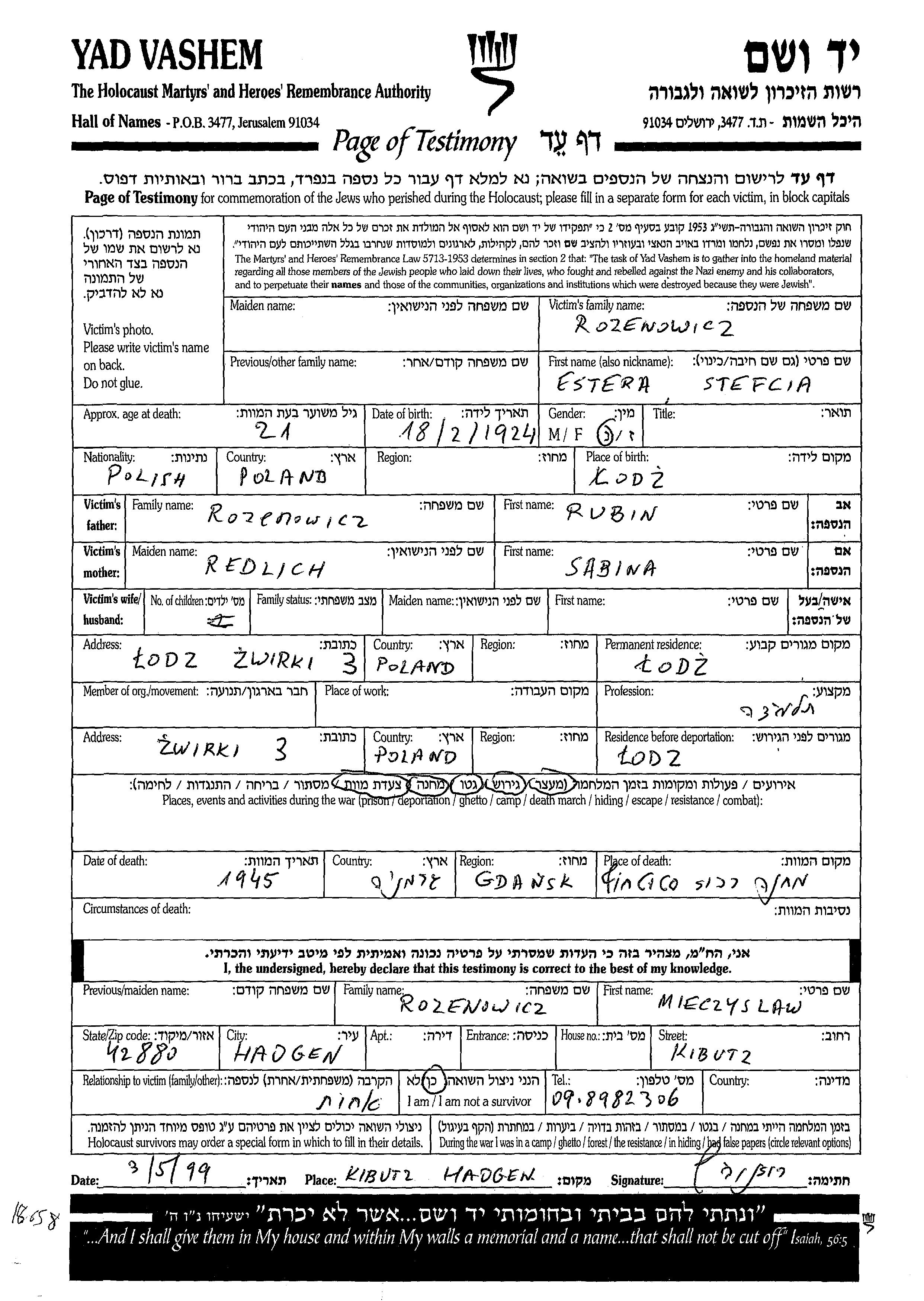 | Rozenowicz | Estera Stefcia | 1924 | Lodz, Polen | Gedenkblatt |