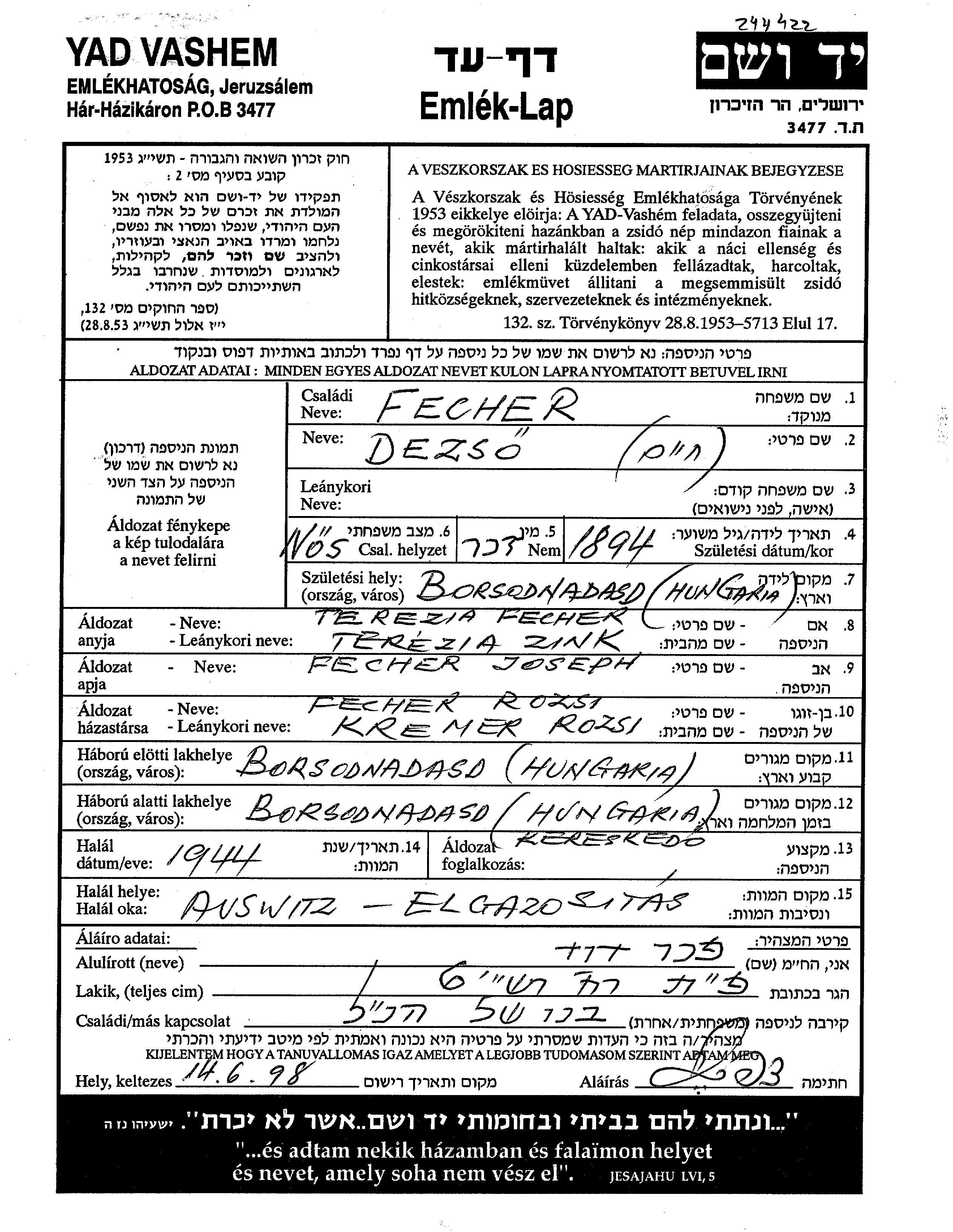 Dezso Khaim Fecher wurde im Jahr 1894 in Borsodnadasd, Ungarn geboren. Er war Kaufmann/-frau. Vor dem Zweiten Weltkrieg lebte er in Borsodnadasd, Ungarn.