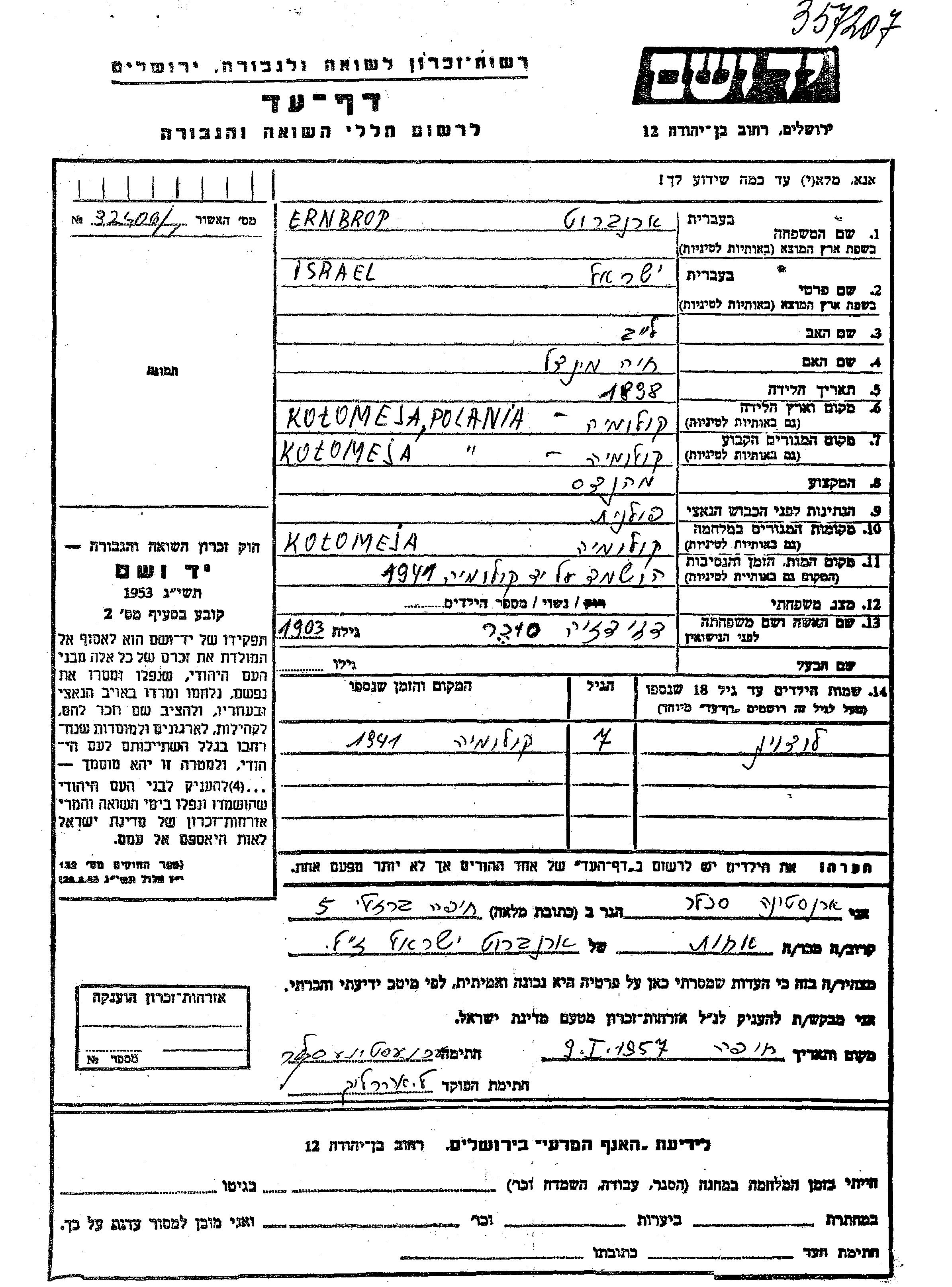 Israel Ernbrot wurde im Jahr 1898 in Kolomyja, Polen geboren. Er war Ingenieur. Vor dem Zweiten Weltkrieg lebte er in Kolomyja, Polen.