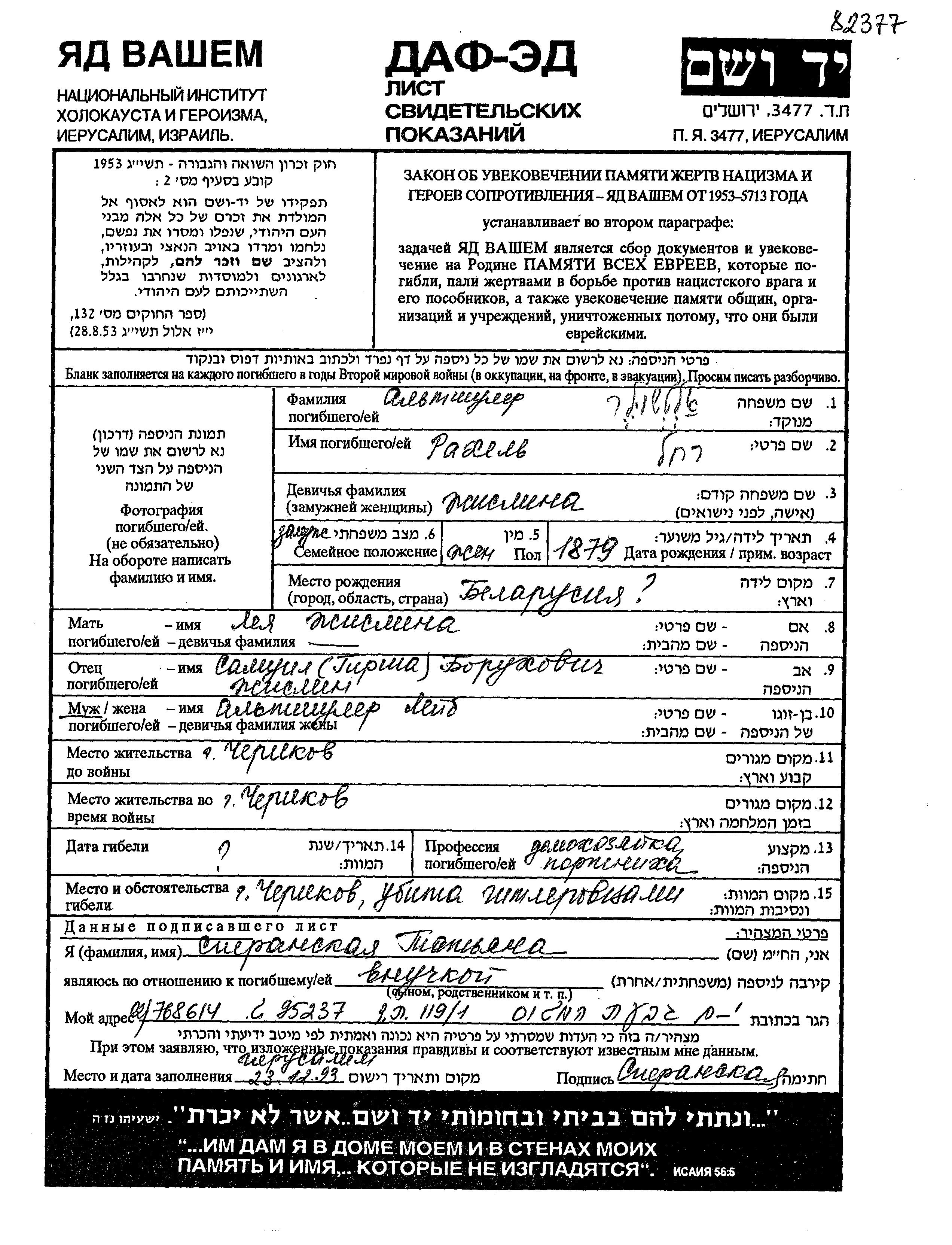 Rakhel wurde in der Schoah ermordet. Todesort: Cherikov, Weißrussland (UdSSR) im Jahr 1941.