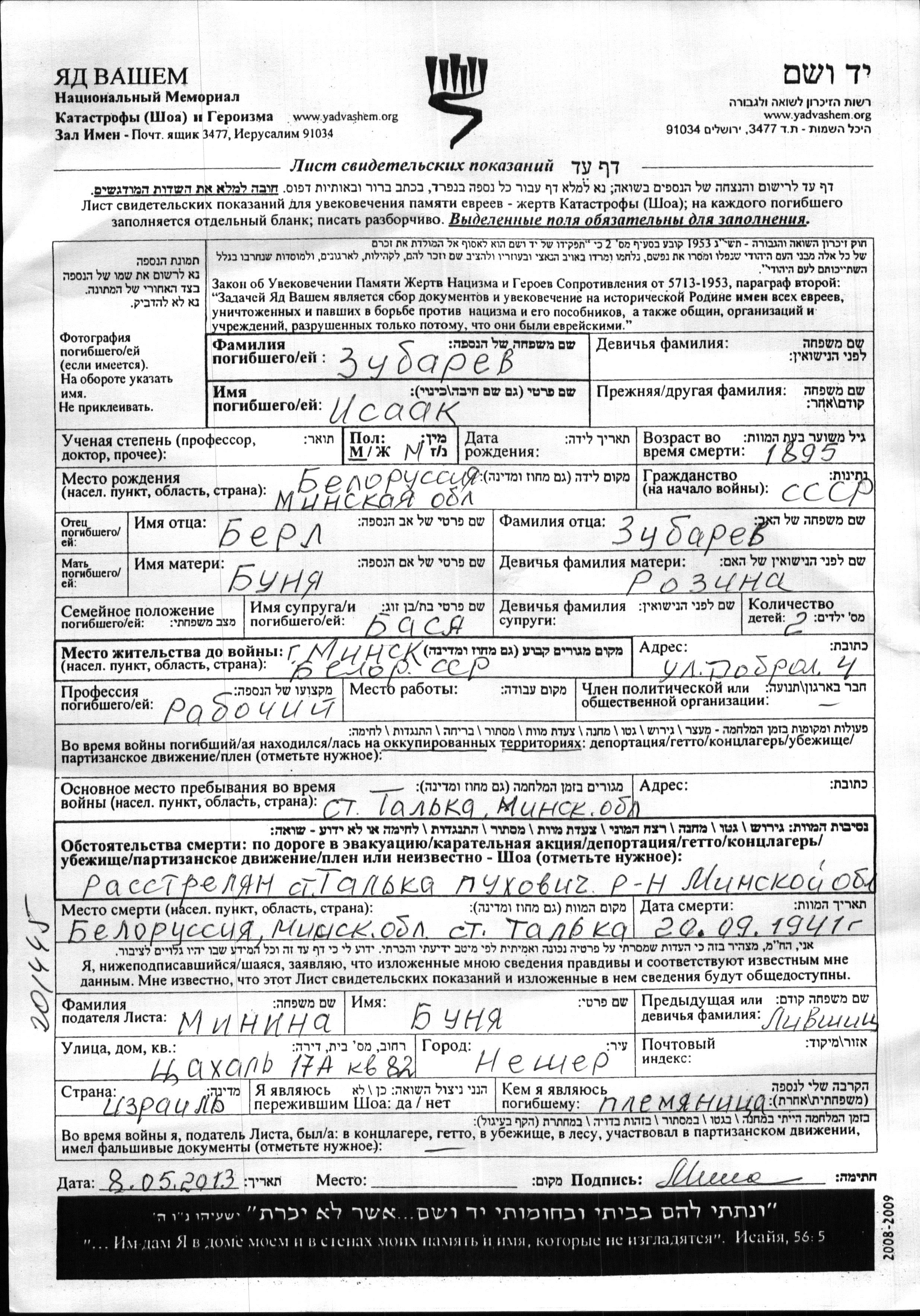 Isaak wurde in der Schoah ermordet. Todesort: Talka Area, Weißrussland (UdSSR) im Jahr 20/09/1941.