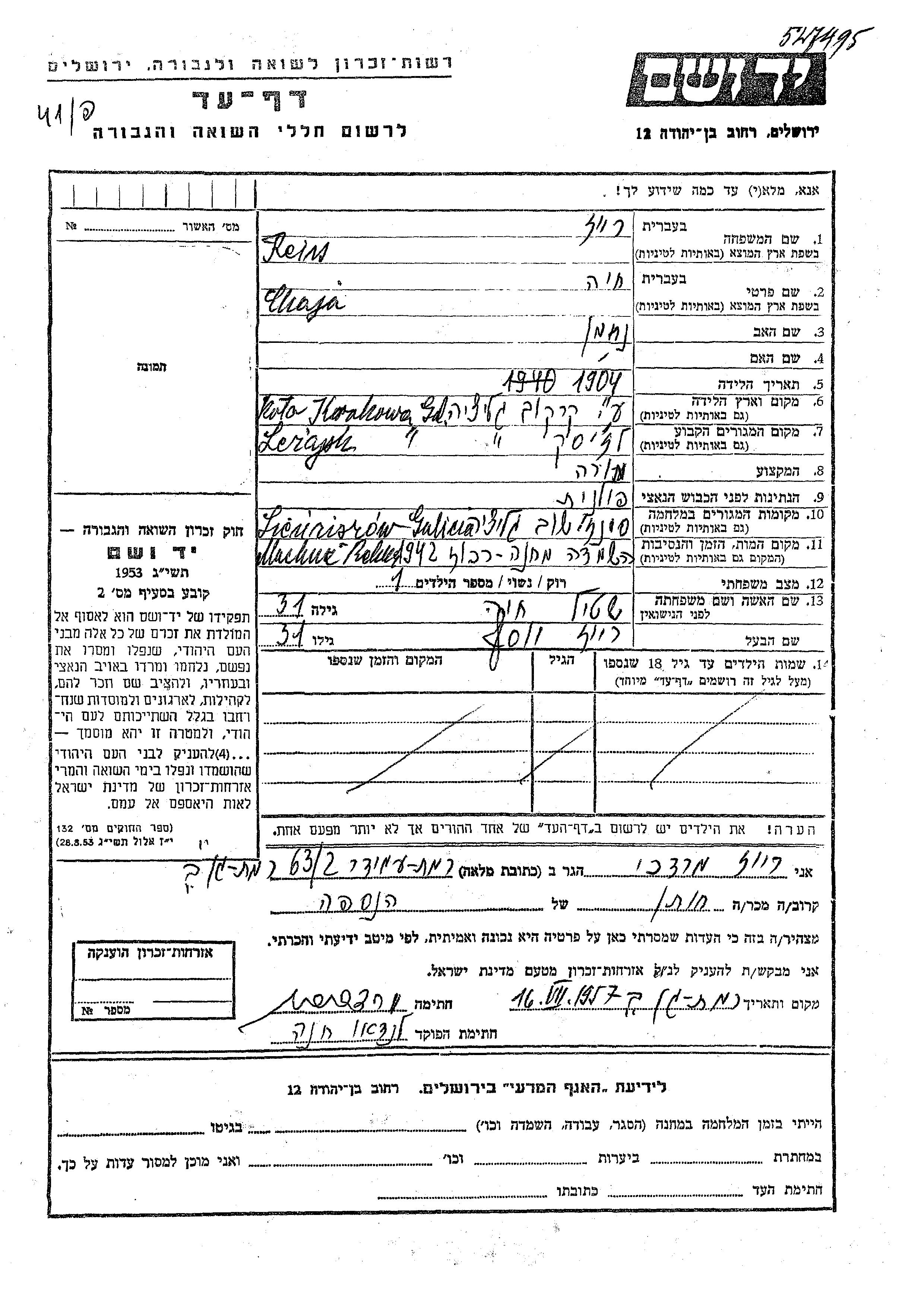 Reis Chaia Lezajsk, Polen Liste ermordeter Juden aus Gedenkbuechern (Yizkor Books)