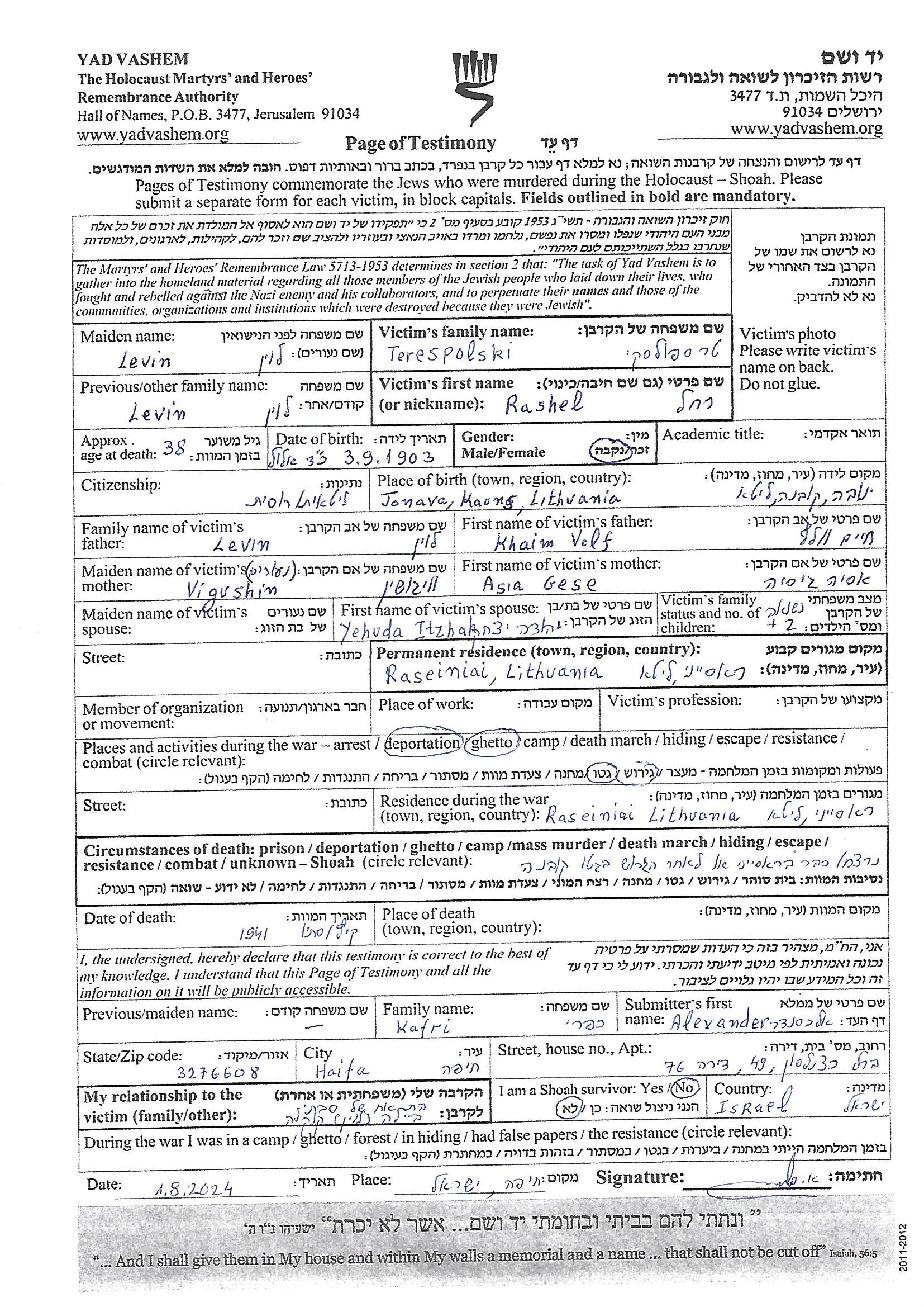 Rashel Terespolski, geb. Levin wurde im Jahr 1903 in Jonava, Litauen geboren. Sie war die Tochter von Khaim Volf und Asia Gese, geb. Vigushin. Sie war mit Yehuda Itzhak Verheiratet. Vor dem Zweiten Weltkrieg lebte sie in Raseinai, Litauen. Während des Krieges war sie in Kaunas, Litauen.