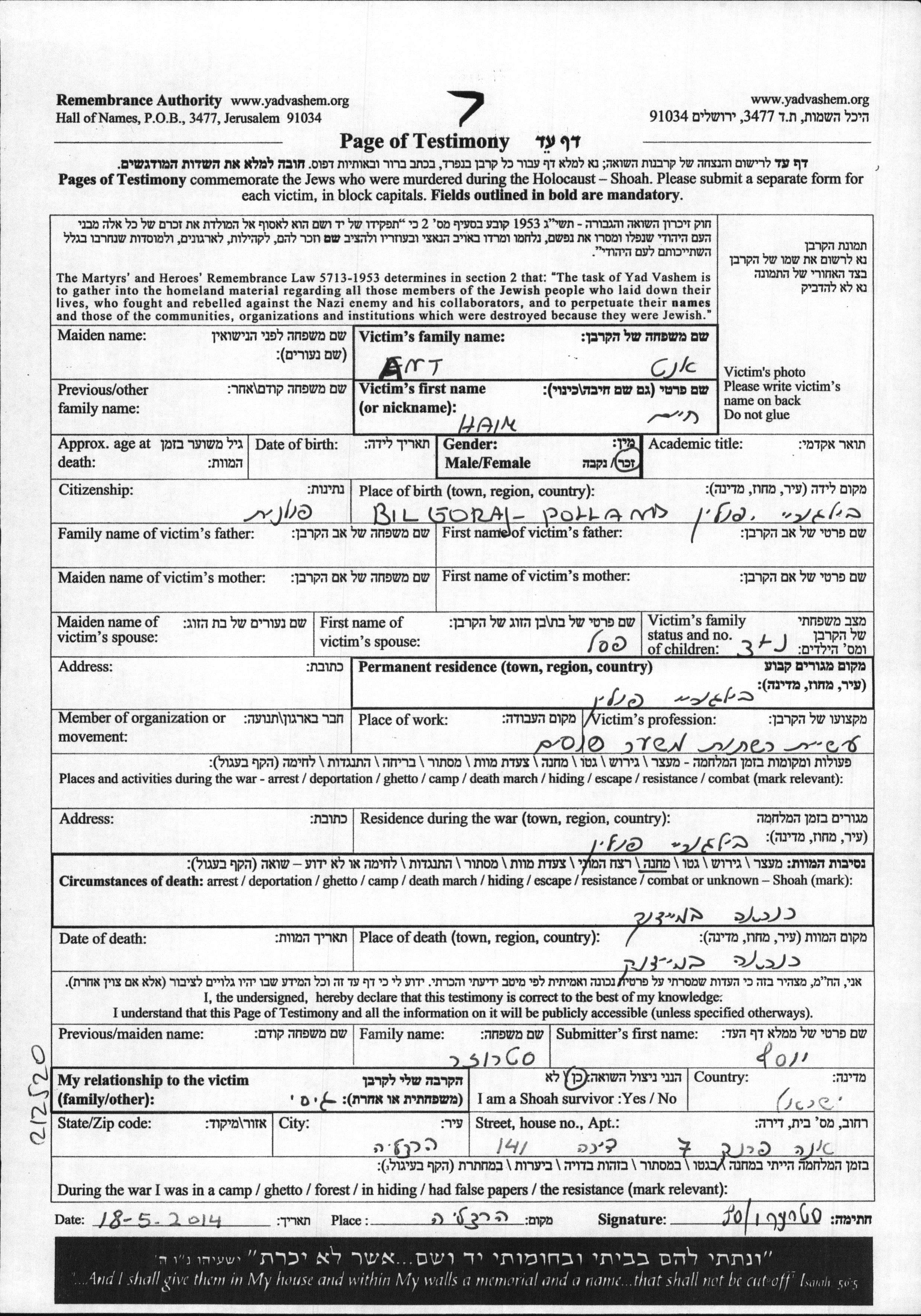 | Ant | Haim | Bilgoraj, Polen | Gedenkblatt | |