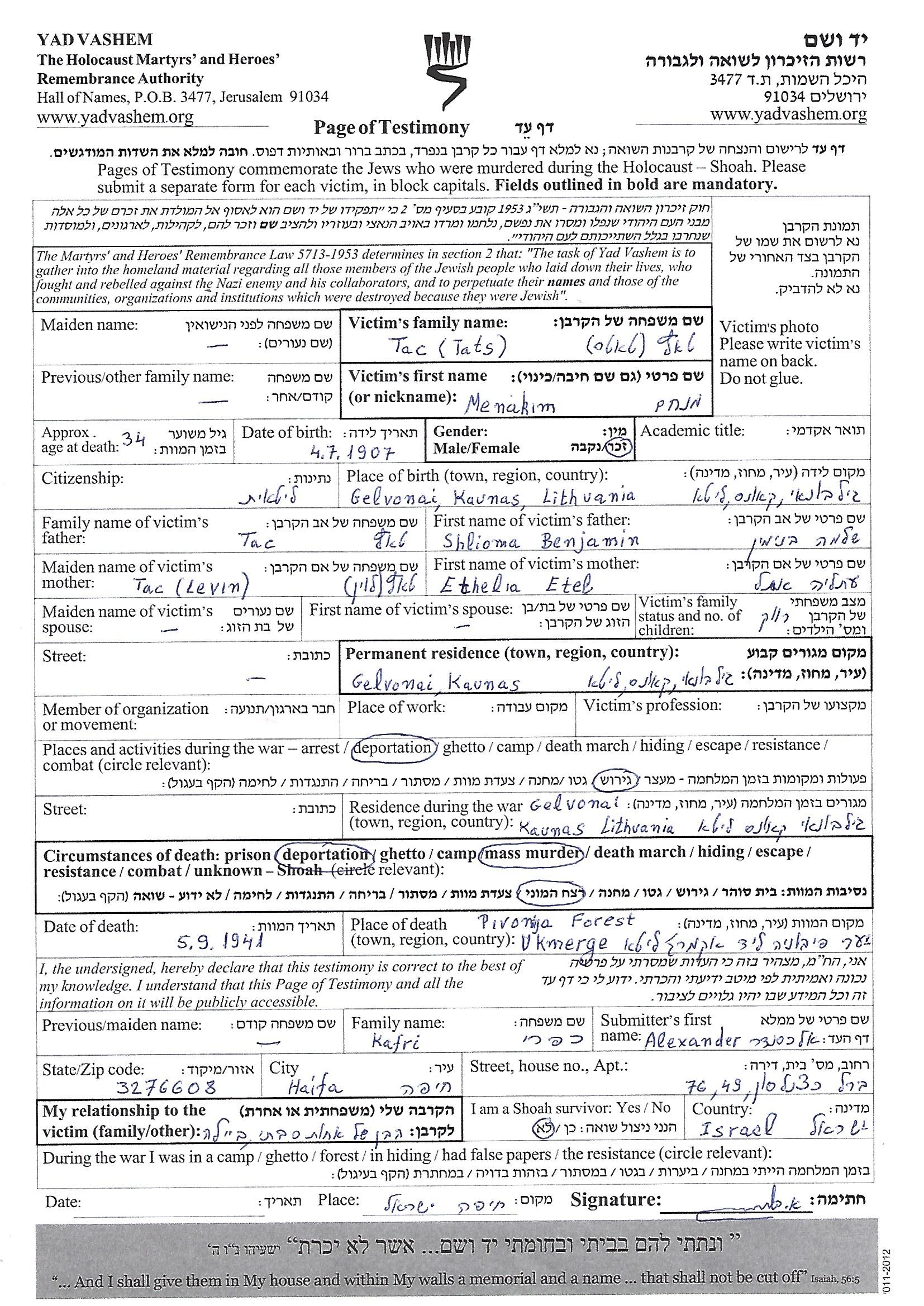 Menakhem wurde in der Schoah ermordet. Todesort: Pivonija Forest, Litauen im Jahr 05/09/1941.
