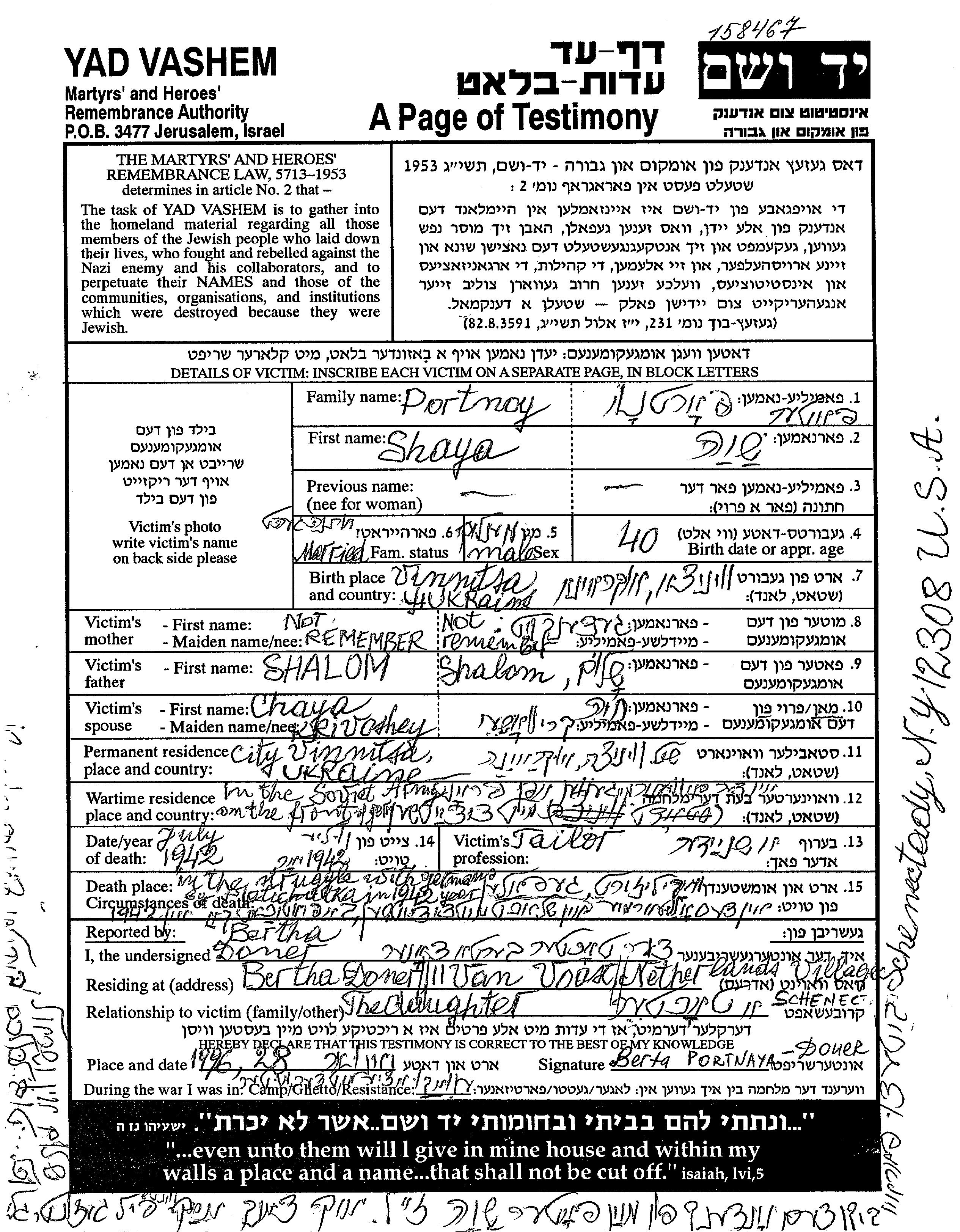 Portnoy Shaya 1902 Vinnitsa, Ukraine (UdSSR) Verfolgtenliste