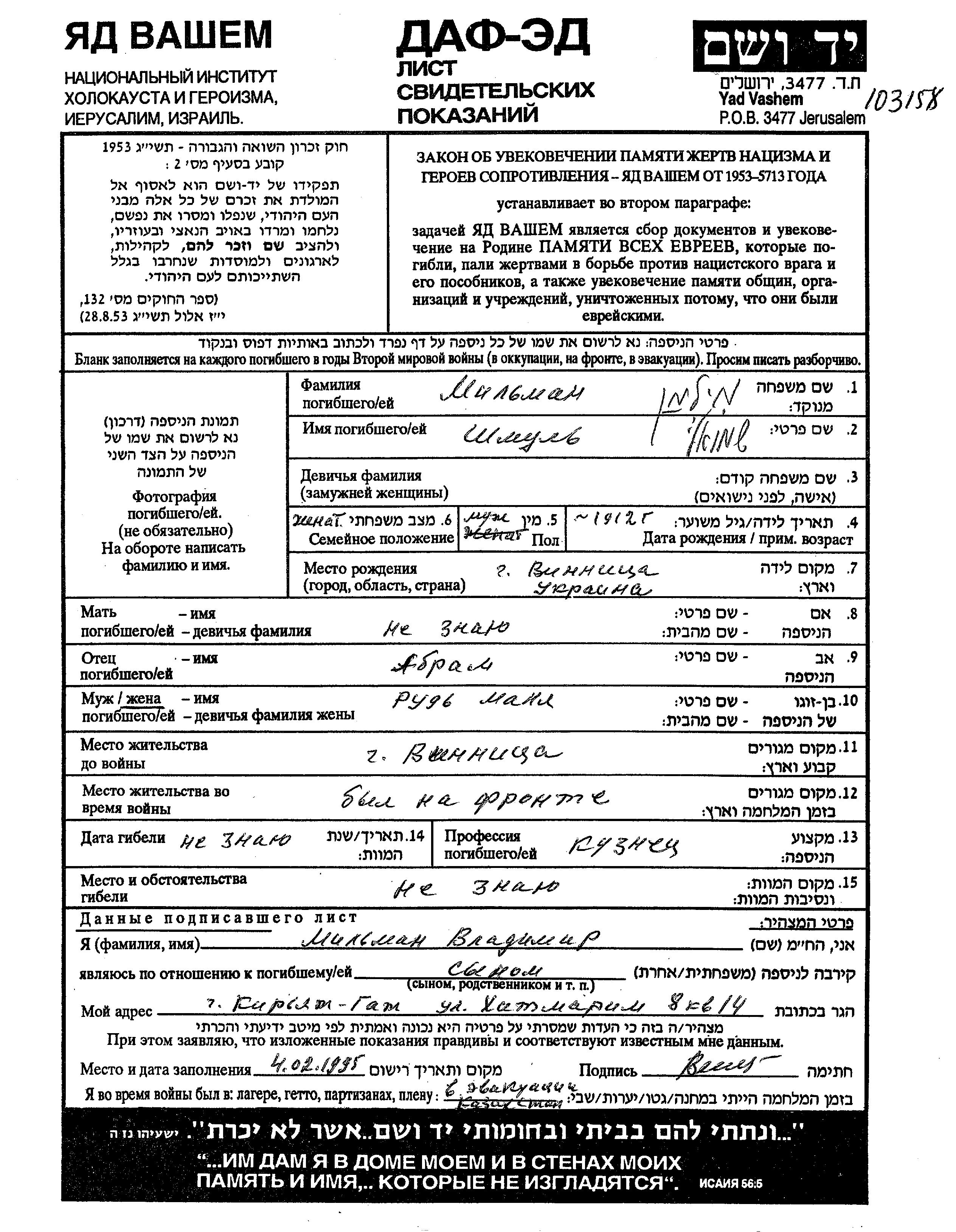 Milman Shmul 1909 Ukraine (UdSSR) Verfolgtenliste