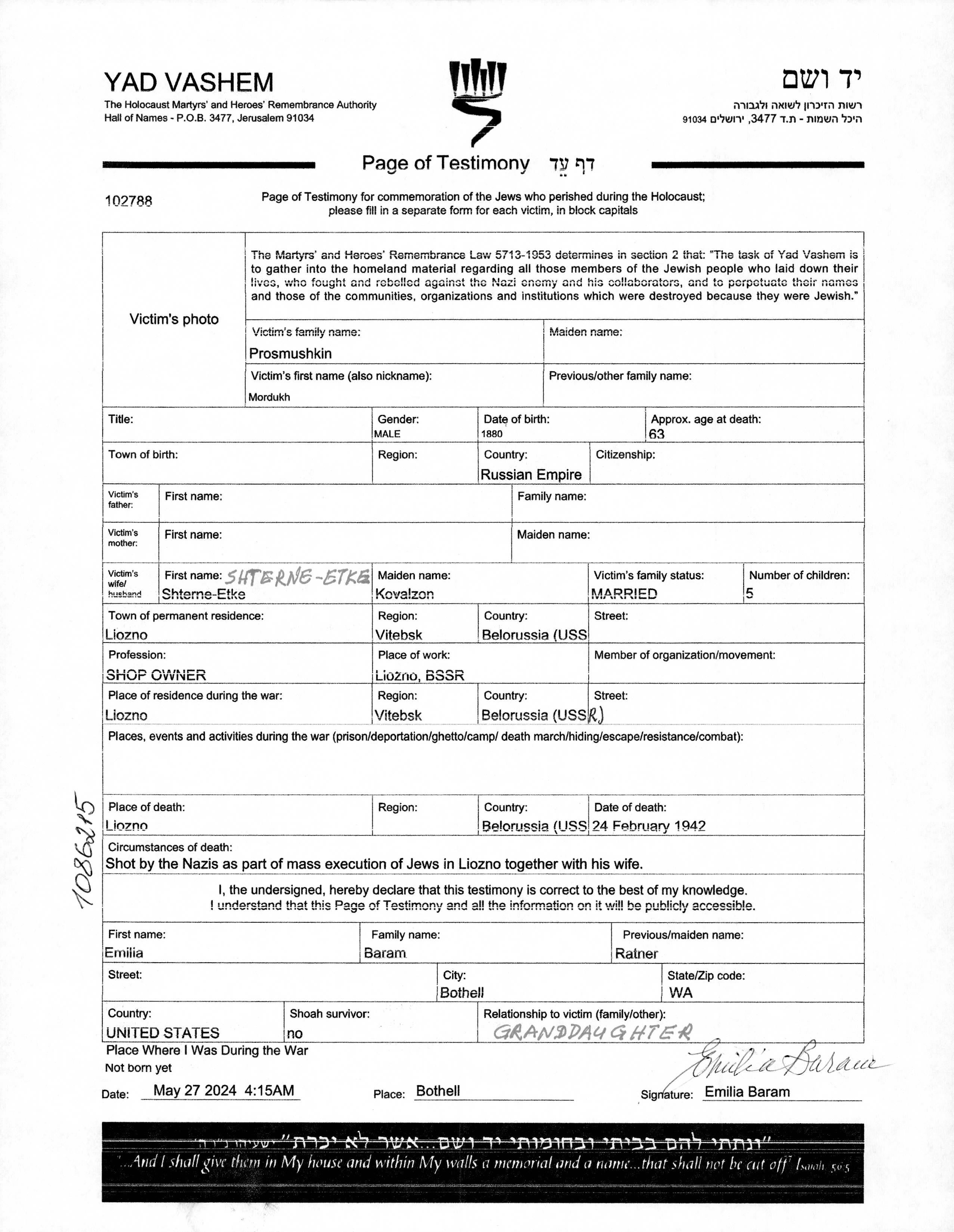 Prosmushkin | Mordukh | 1880 | Liozno, Weißrussland (UdSSR) | Gedenkblatt (digital, unterzeichnet) |