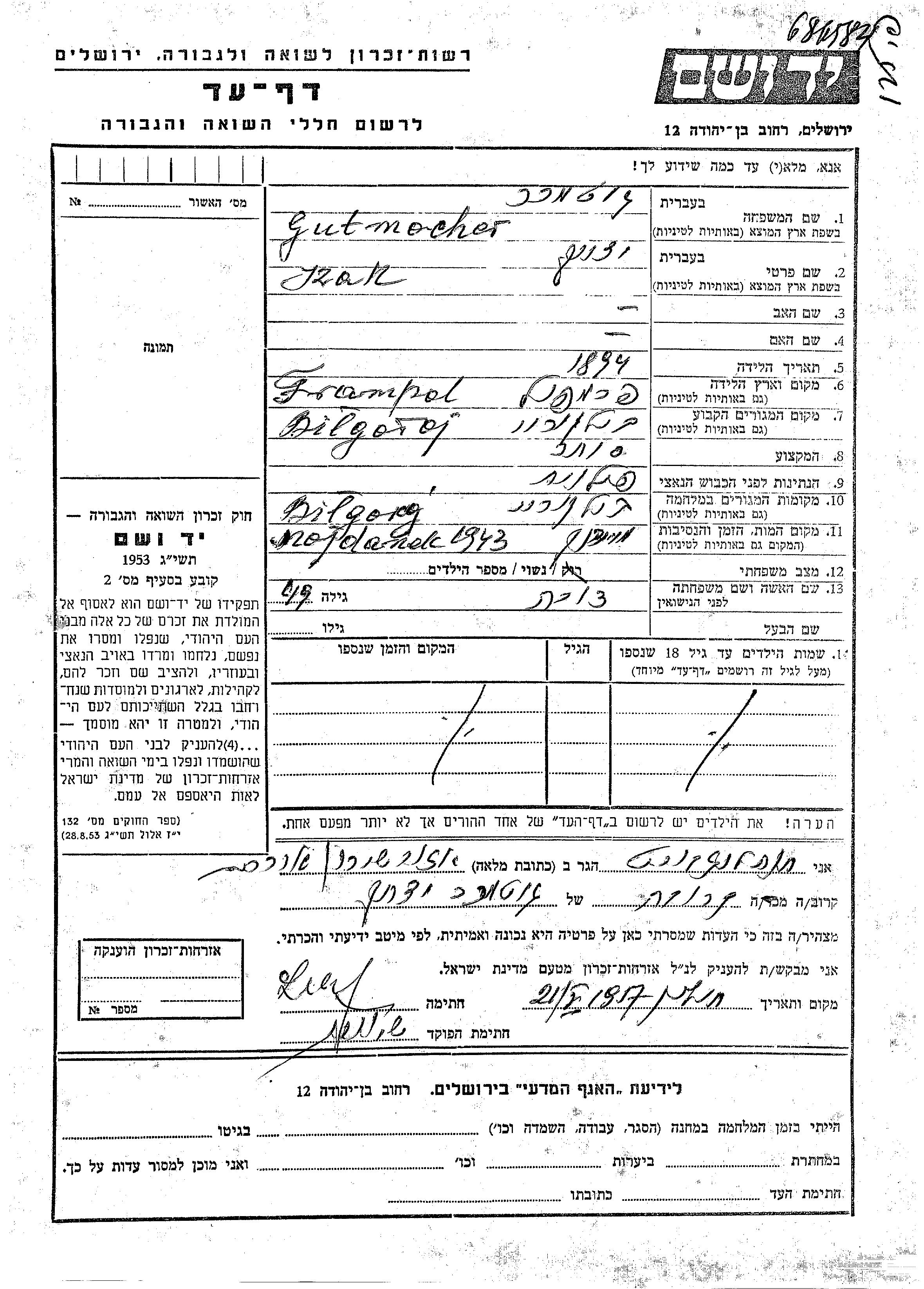 Yitzkhak Gutmacher wurde im Jahr 1902 in Frampol, Polen geboren. Er war Kaufmann/-frau. Vor dem Zweiten Weltkrieg lebte er in Bilgoraj, Polen.