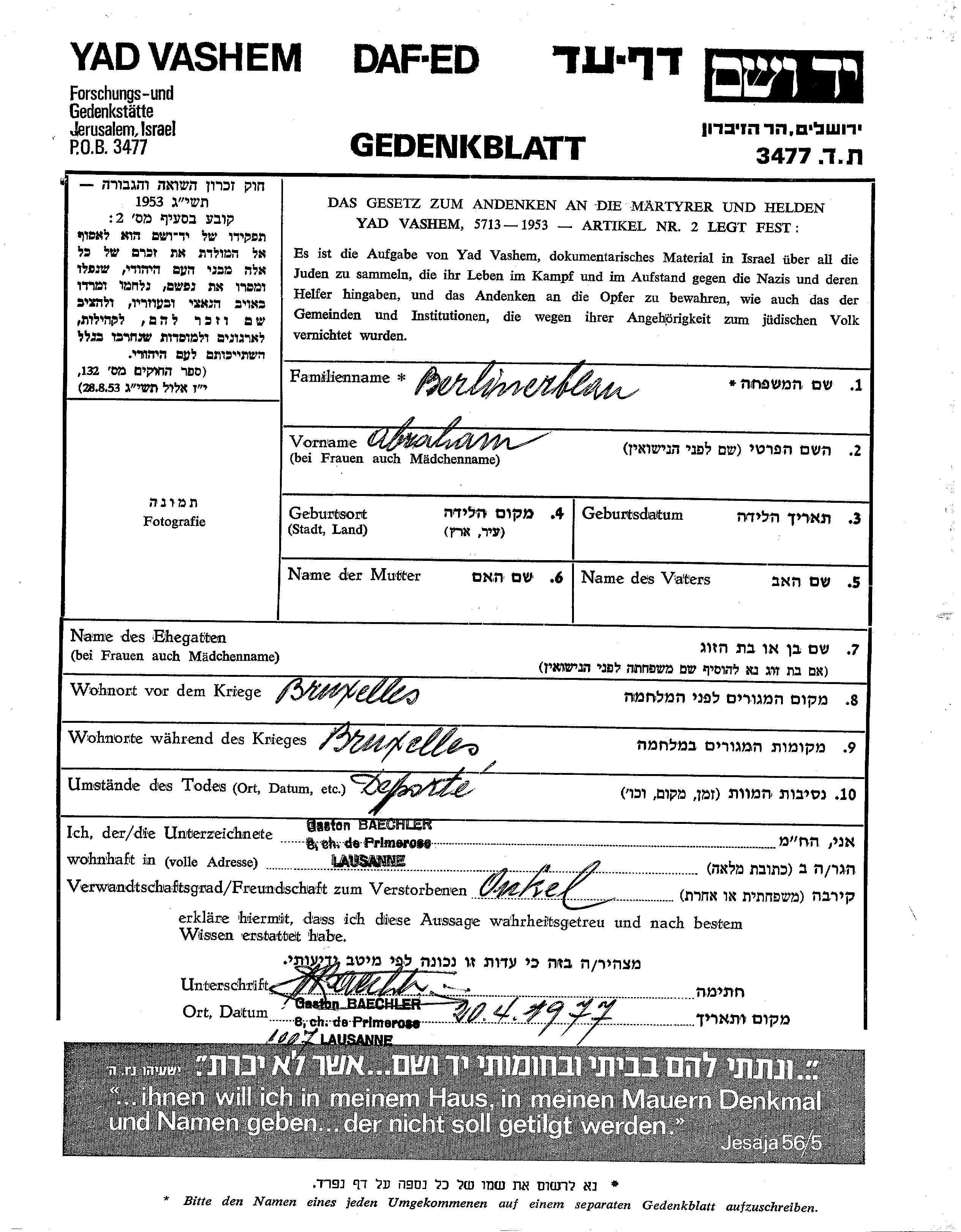 Abraham Berlinerblau wurde im Jahr 1884 in Warschau, Polen geboren. Er war Uhrmacher/-in. Vor dem Zweiten Weltkrieg lebte er in Bruxelles, Belgien.