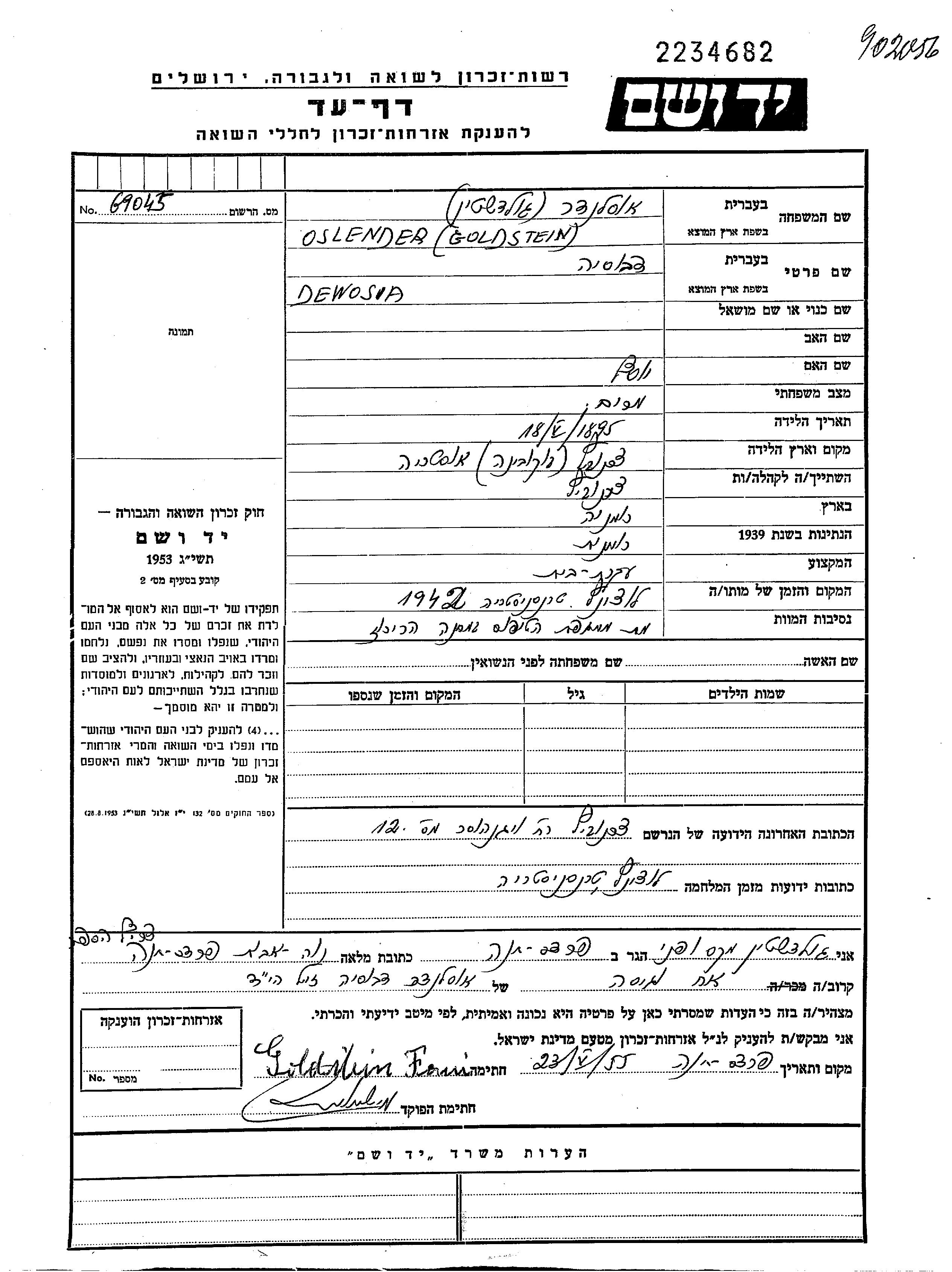 Oslender Goldstein | Dewosia | 1895 | Czernowitz, Rumänien | Gedenkblatt |
