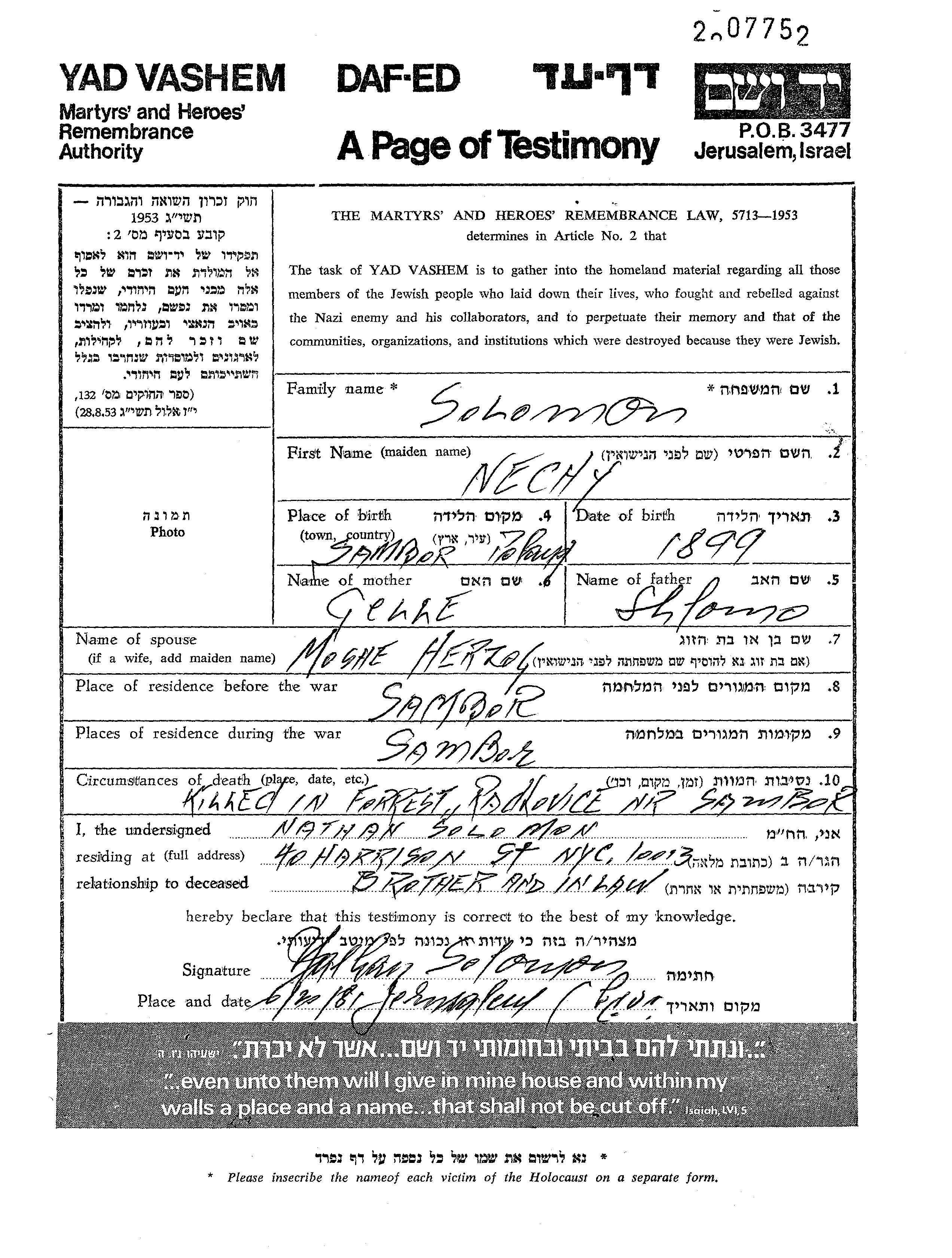 Solomon Herzog Sholomon | Nechy | 1899 | Sambor, Polen | Gedenkblatt |