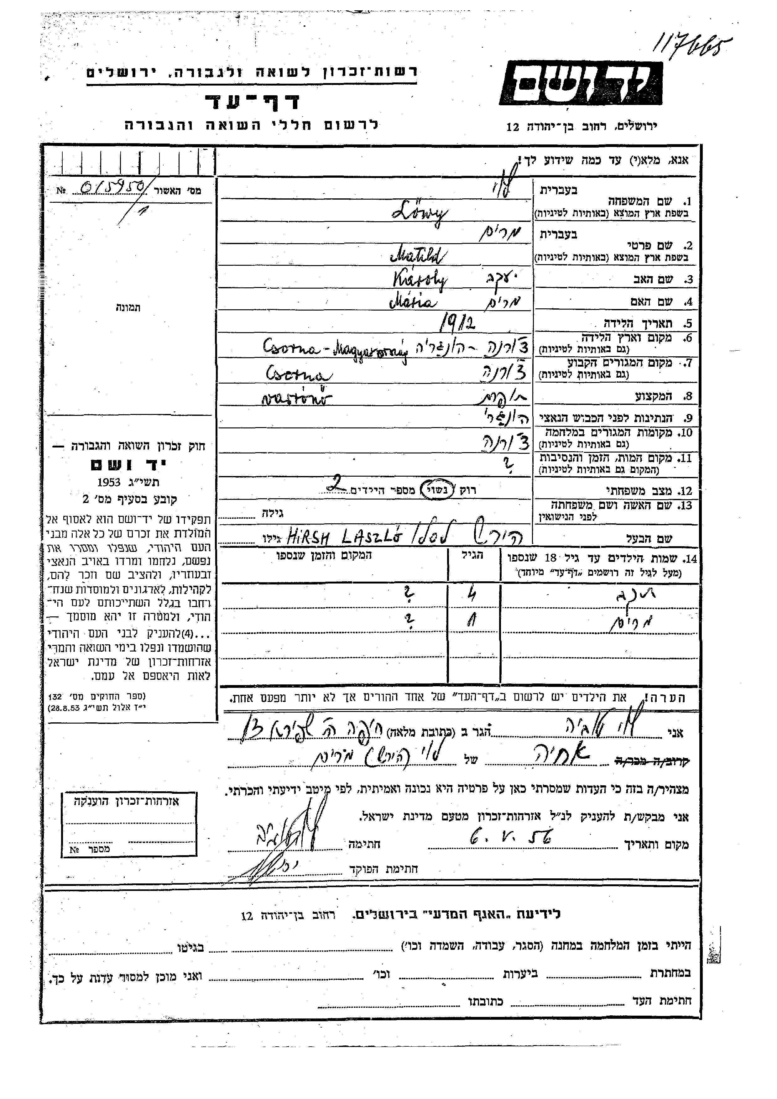 Lowy Hirsh Matild Miriam 1912 Csorna, Gedenkblatt