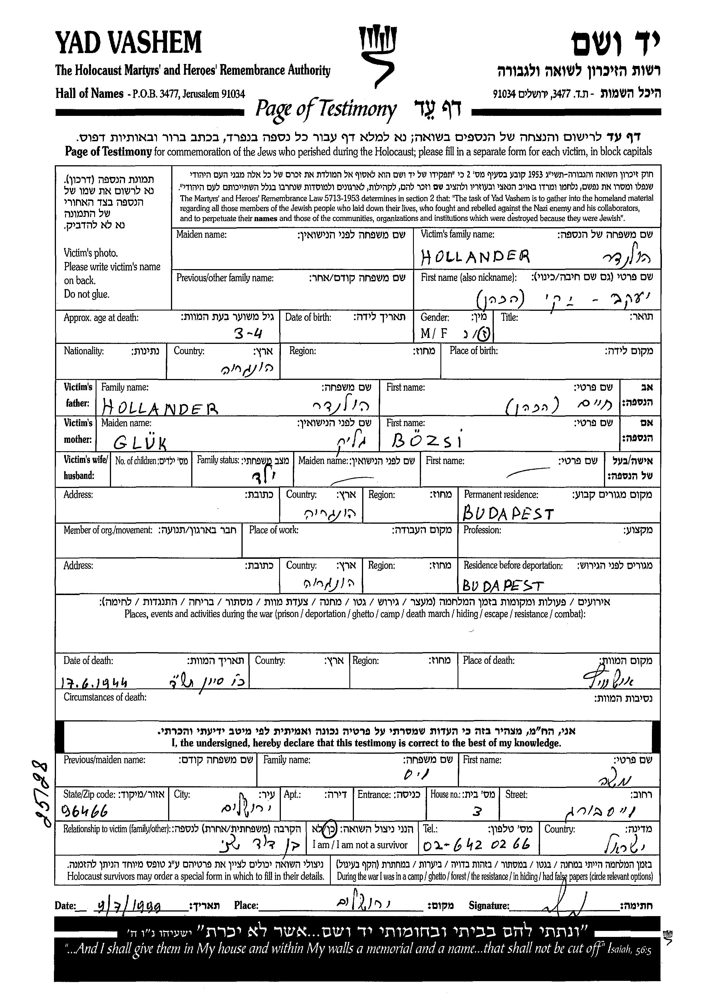 Hollander | Yaakov | Budapest, Ungarn | Gedenkblatt | |