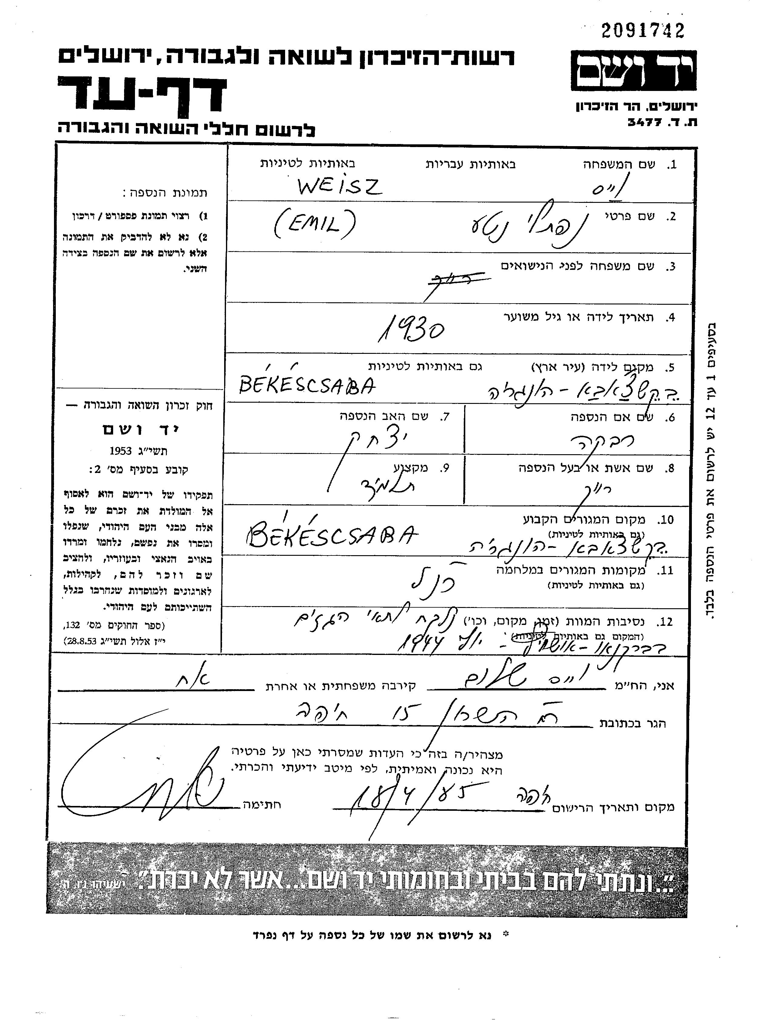 Weisz | Nate Naftali Emil | 1930 | Békéscsaba, Ungarn | Gedenkblatt |