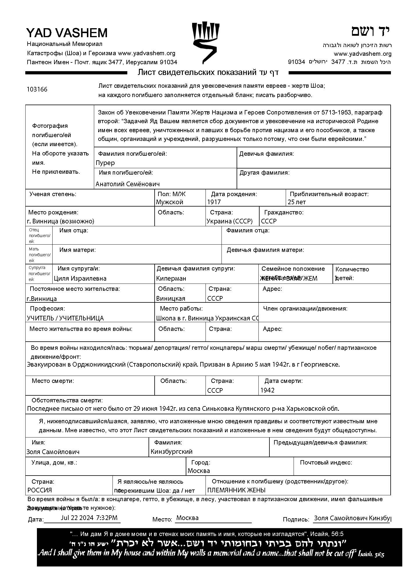 Anatoliy Purer wurde im Jahr 1913 in Vinnitsa, Ukraine (UdSSR) geboren. Er war Lehrer/in. Vor dem Zweiten Weltkrieg lebte er in Vinnitsa, Ukraine (UdSSR).