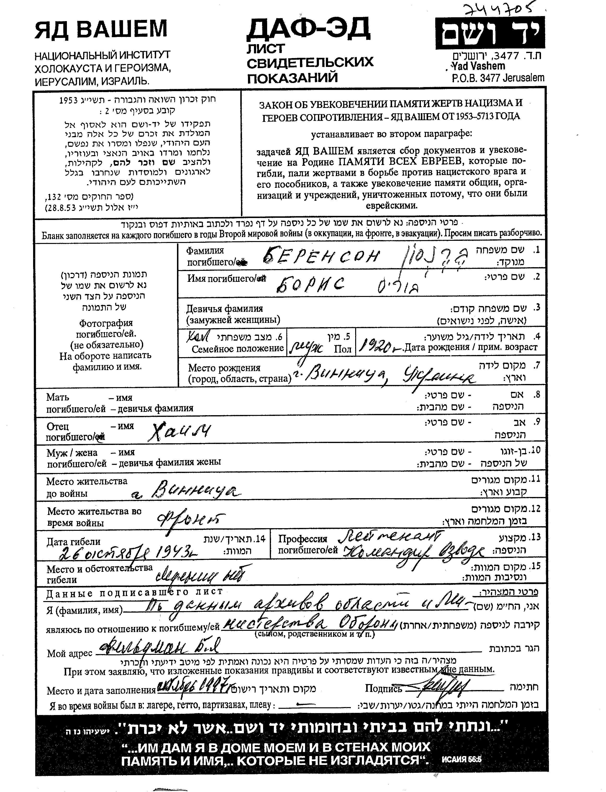 Berenson Boris 1924 Vinnitsa, Ukraine (UdSSR) Gedenkblatt