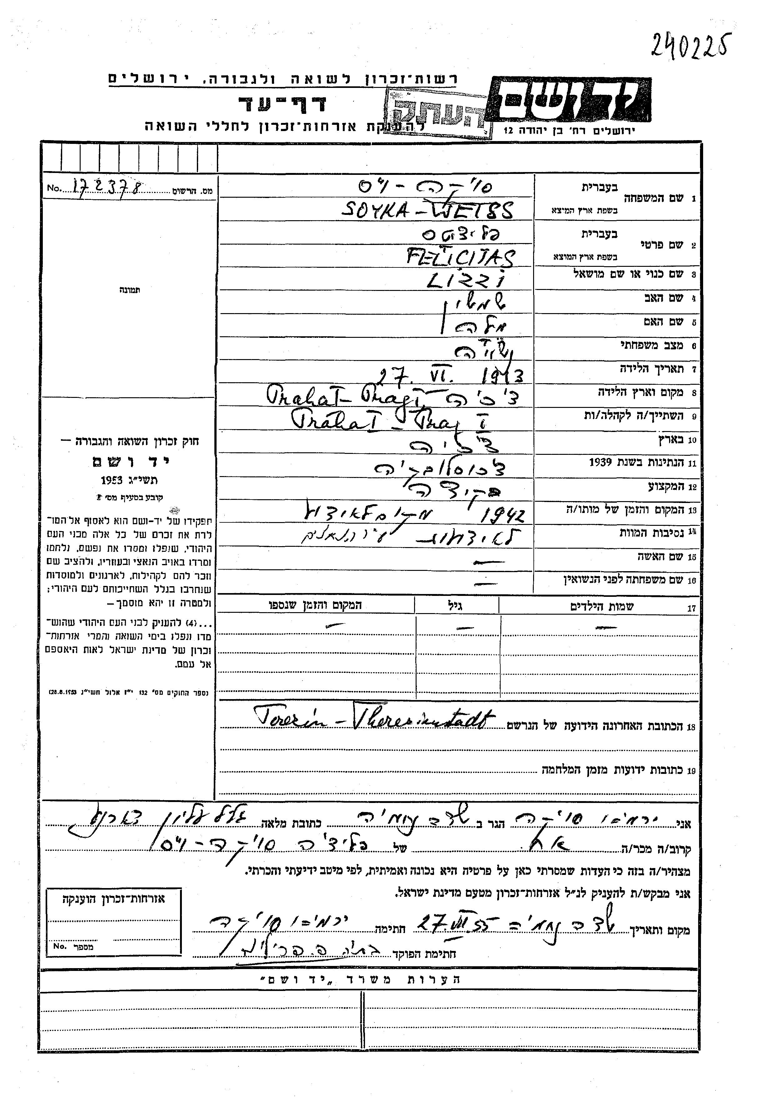 Felitzia Weiss, geb. Soyka wurde im Jahr 1913 in Praha, Tschechoslowakei geboren. Sie war Angestellte/-r. Vor dem Zweiten Weltkrieg lebte sie in Praha, Tschechoslowakei.