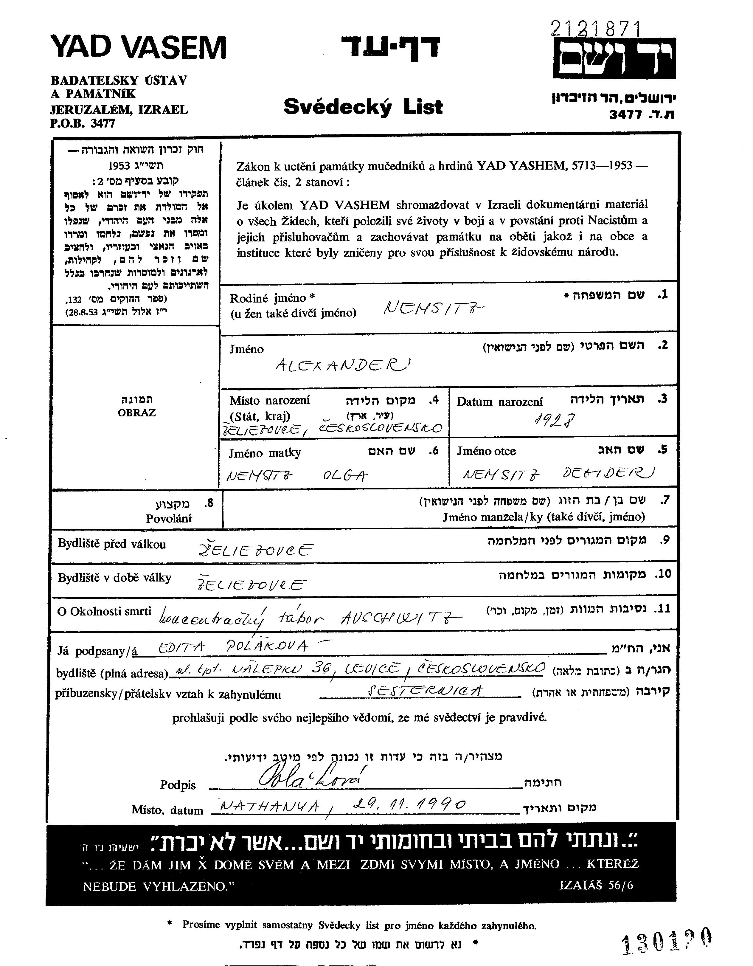 Nemsitz Alexander 1928 Zeliezovce, Tschechoslowakei Gedenkblatt