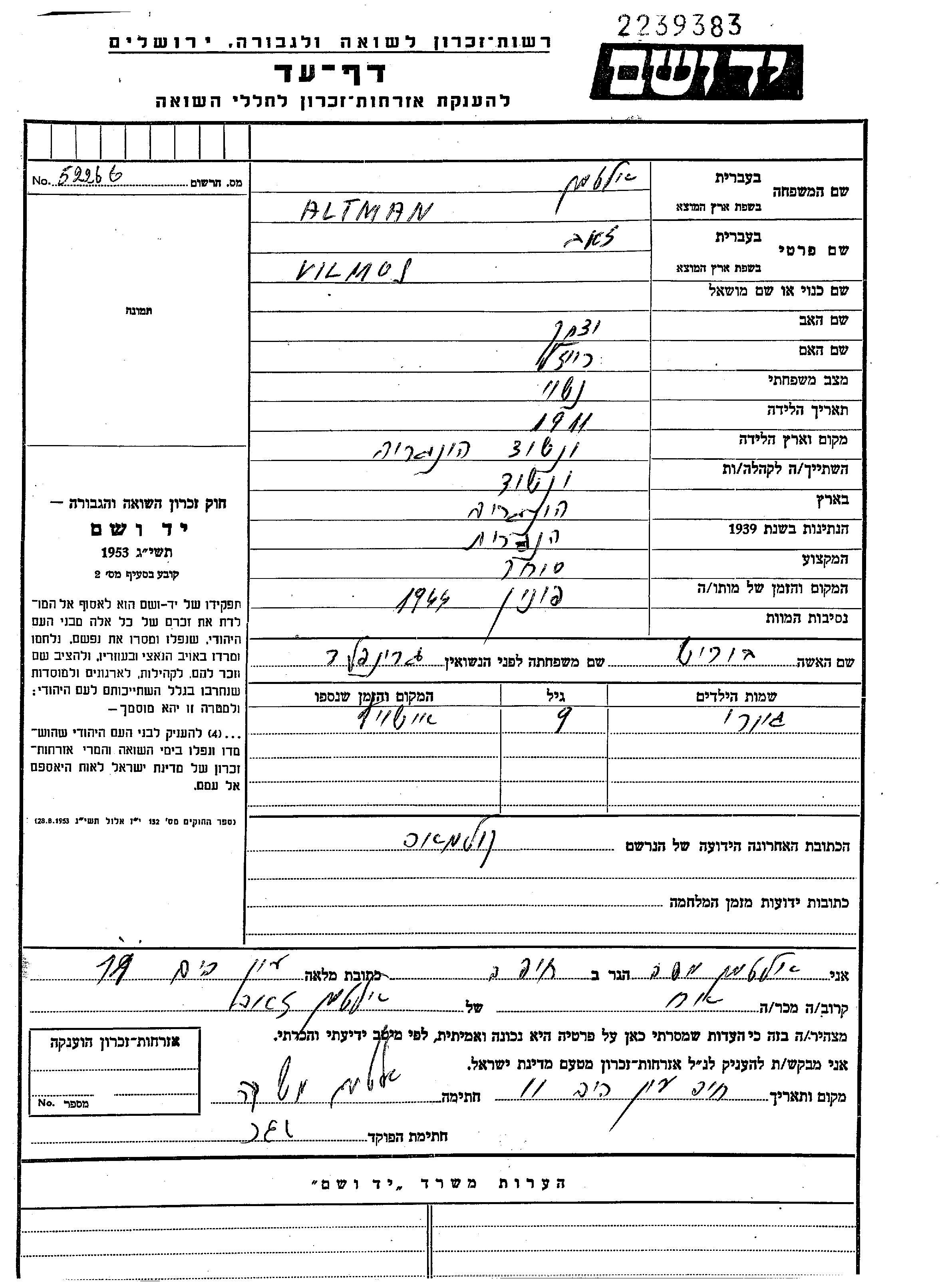 Vilmosh Zeev Altman wurde im Jahr 1911 in Vancsod, Ungarn geboren. Er war Kaufmann/-frau. Vor dem Zweiten Weltkrieg lebte er in Told, Ungarn.