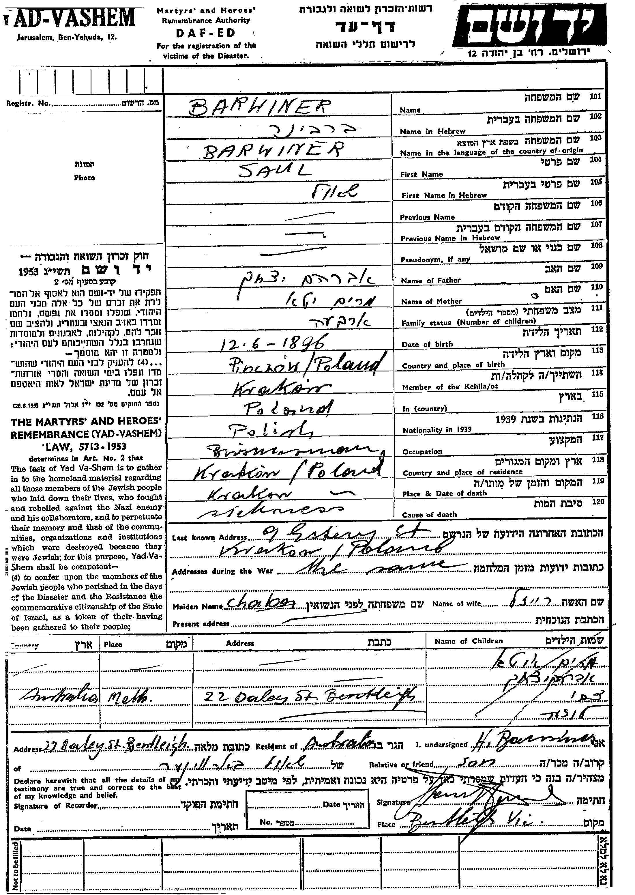 Saul Barviner wurde im Jahr 1896 in Pinczow, Polen geboren. Er war Kaufmann/-frau. Vor dem Zweiten Weltkrieg lebte er in Krakow, Polen.