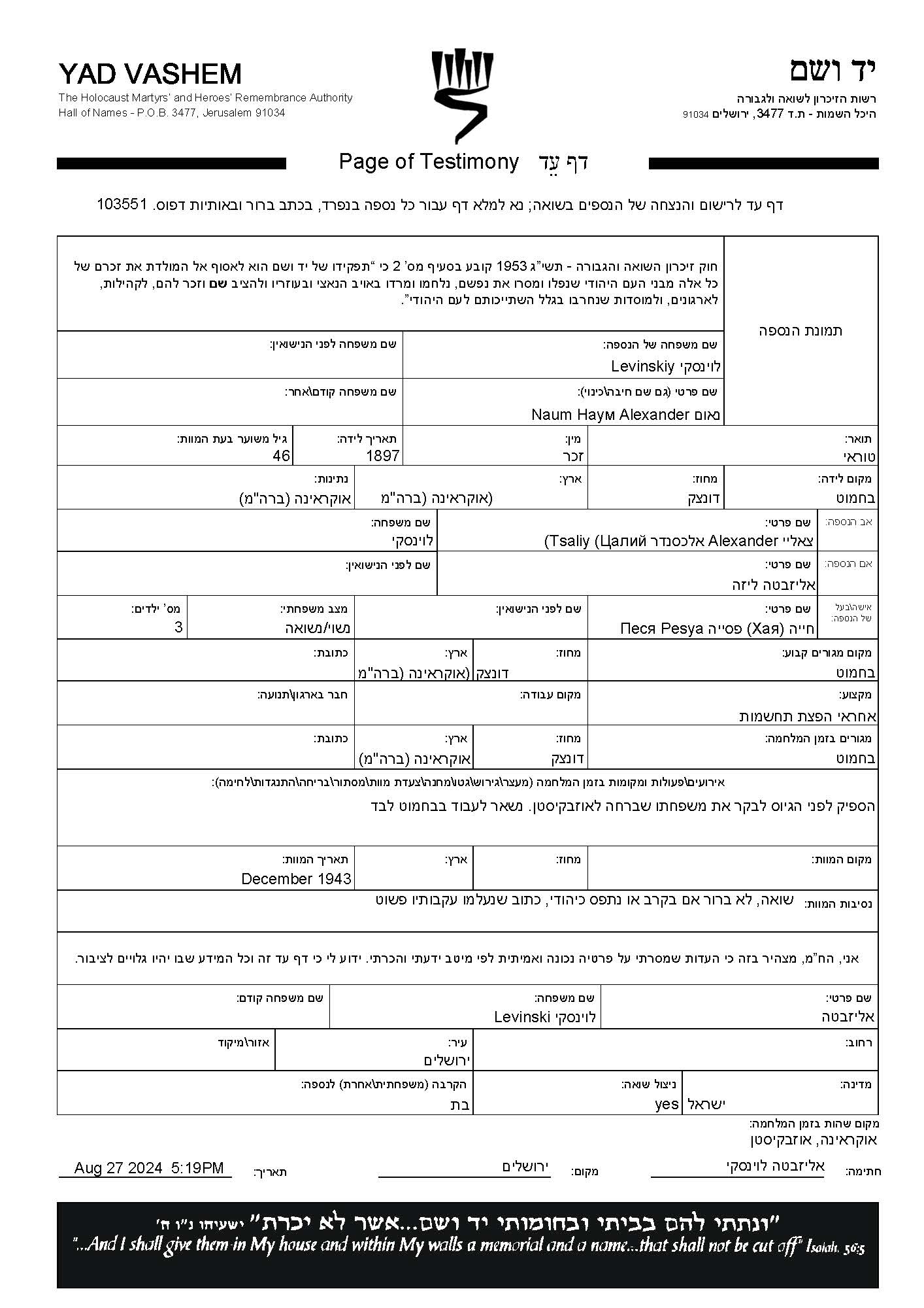 Naum Alexander Haym Levinski wurde im Jahr 1897 in Bakhmut, Ukraine (UdSSR) geboren. Er war Responsible for the distribution of ammunition. Vor dem Zweiten Weltkrieg lebte er in Bakhmut, Ukraine (UdSSR).