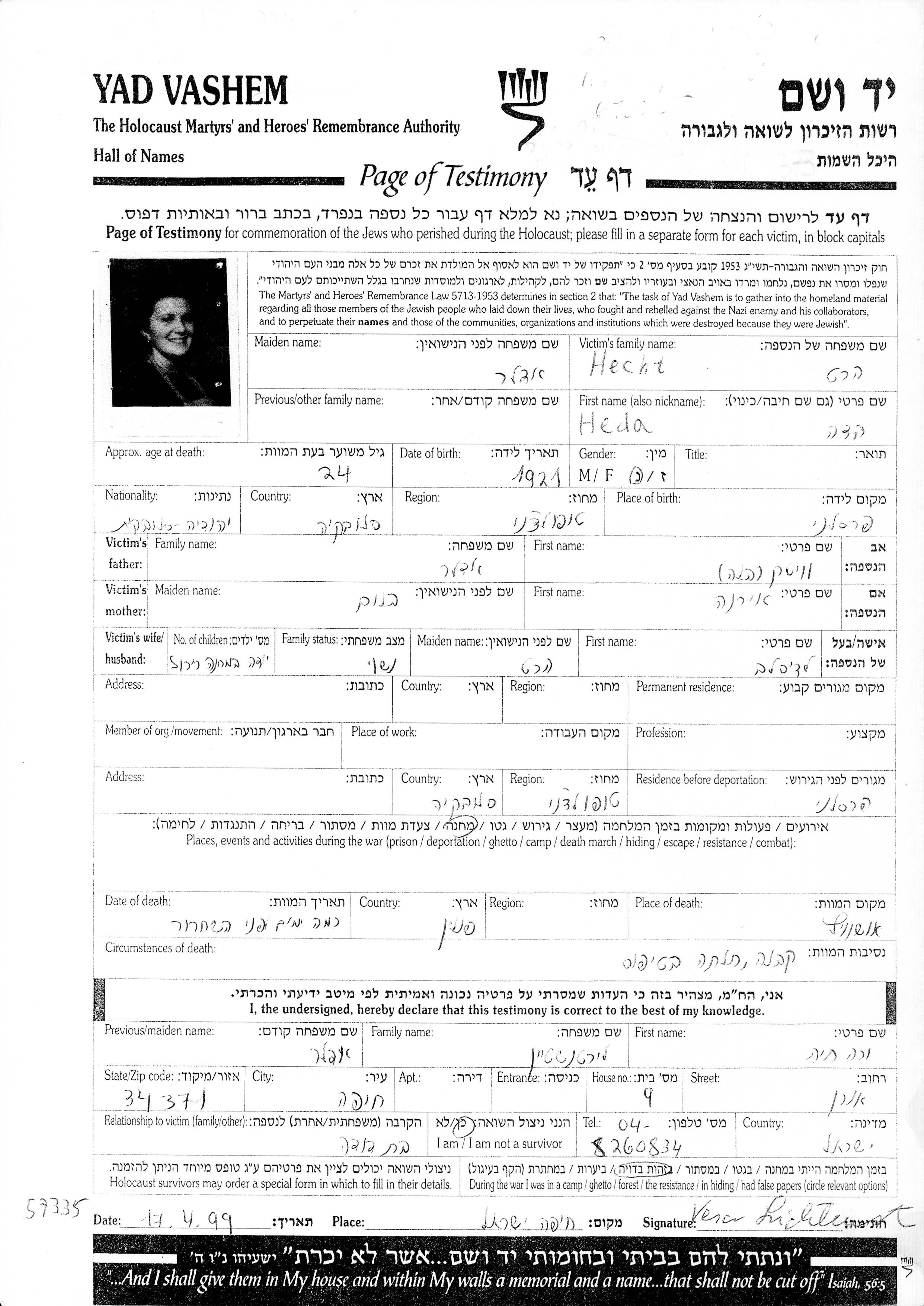 Vorname unbekannt Hecht wurde in Lager geboren. Er/sie war der/ die Sohn/Tochter von Ladislav und Heda, geb. Adler. Er/Sie war Kind. Vor dem Zweiten Weltkrieg er/sie in Lager. Während des Krieges war er/sie in Lager.