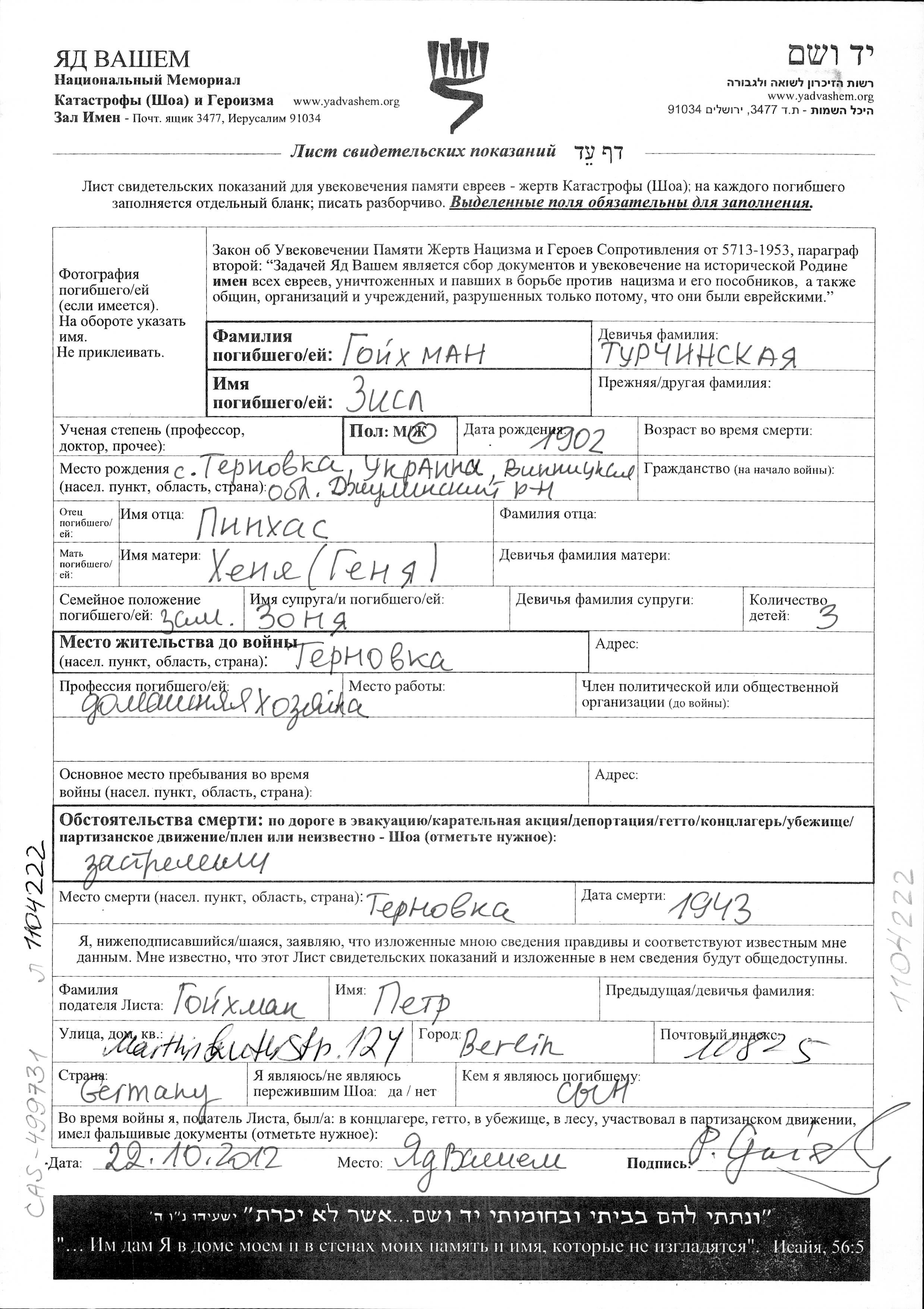 Goychman Zisl 1902 Ternovka, Ukraine (UdSSR) Gedenkblatt