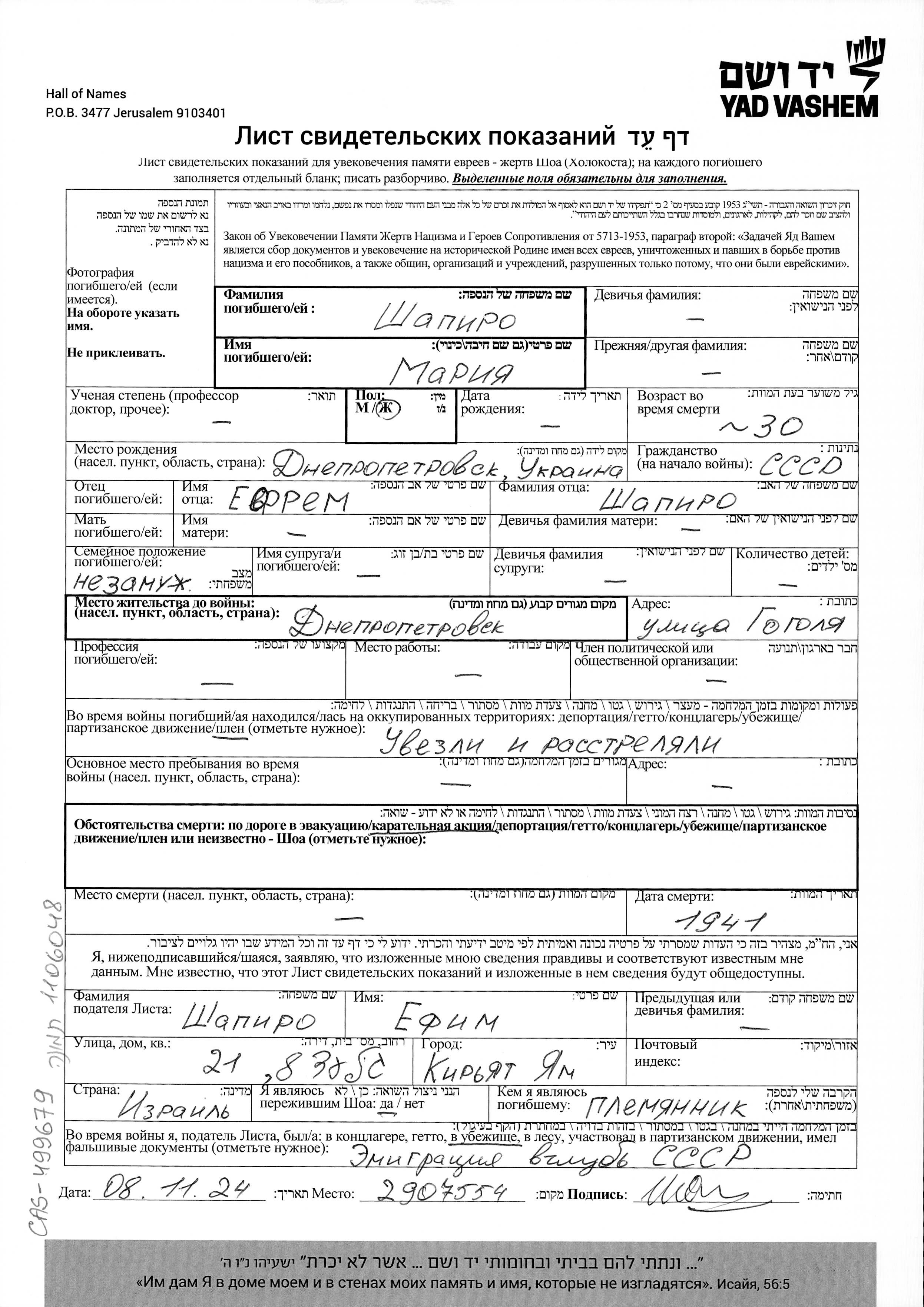 Mariya wurde in der Schoah ermordet. Todesort: Dnepropetrovsk, Ukraine (UdSSR) im Jahr 1941.